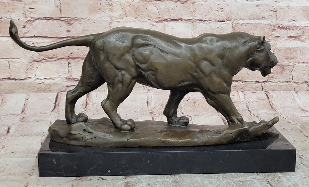 Mounted on a sleek black marble base, this sculpture stands as a testament to the artist Milo's skill and artistry. The combination of meticulous detail, expert use of patina, and thoughtful design makes this piece a striking and timeless tribute to the king of the jungle. Whether displayed as a statement piece or a cherished addition to a collection, it embodies the awe-inspiring power and grace of the lion.