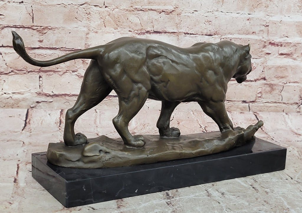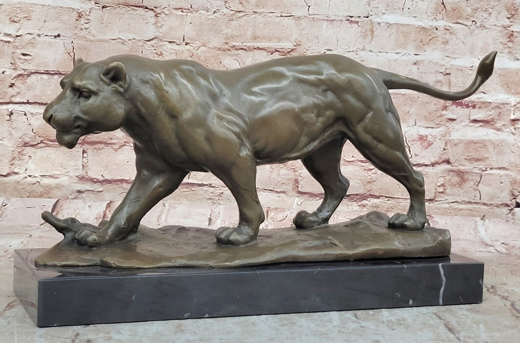 Though the lion is the most feared and lethal predator of the jungle, its beauty is undeniable. This meticulously handcrafted sculpture captures the essence of the king of all wild cats with incredible attention to detail. Every aspect, from the stretch of its powerful limbs to the cut of its muscles and the curve of its back, is carefully rendered to showcase the lion's majestic form. The sculpture even captures the fierce glare of its watchful eyes, embodying the lion's regal and commanding presence.