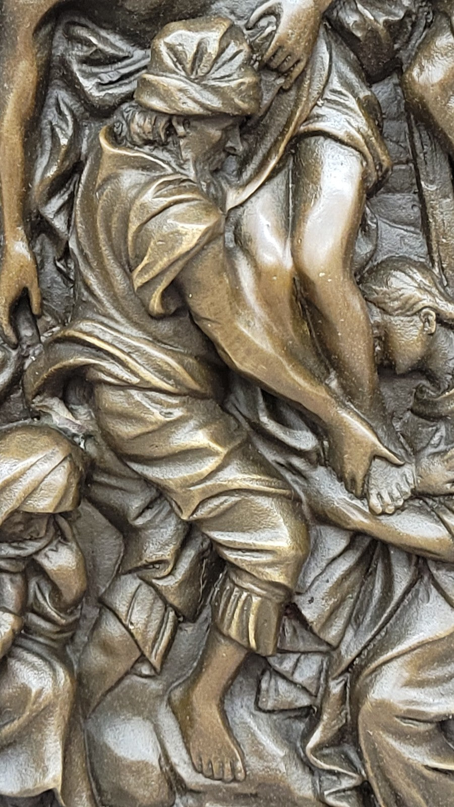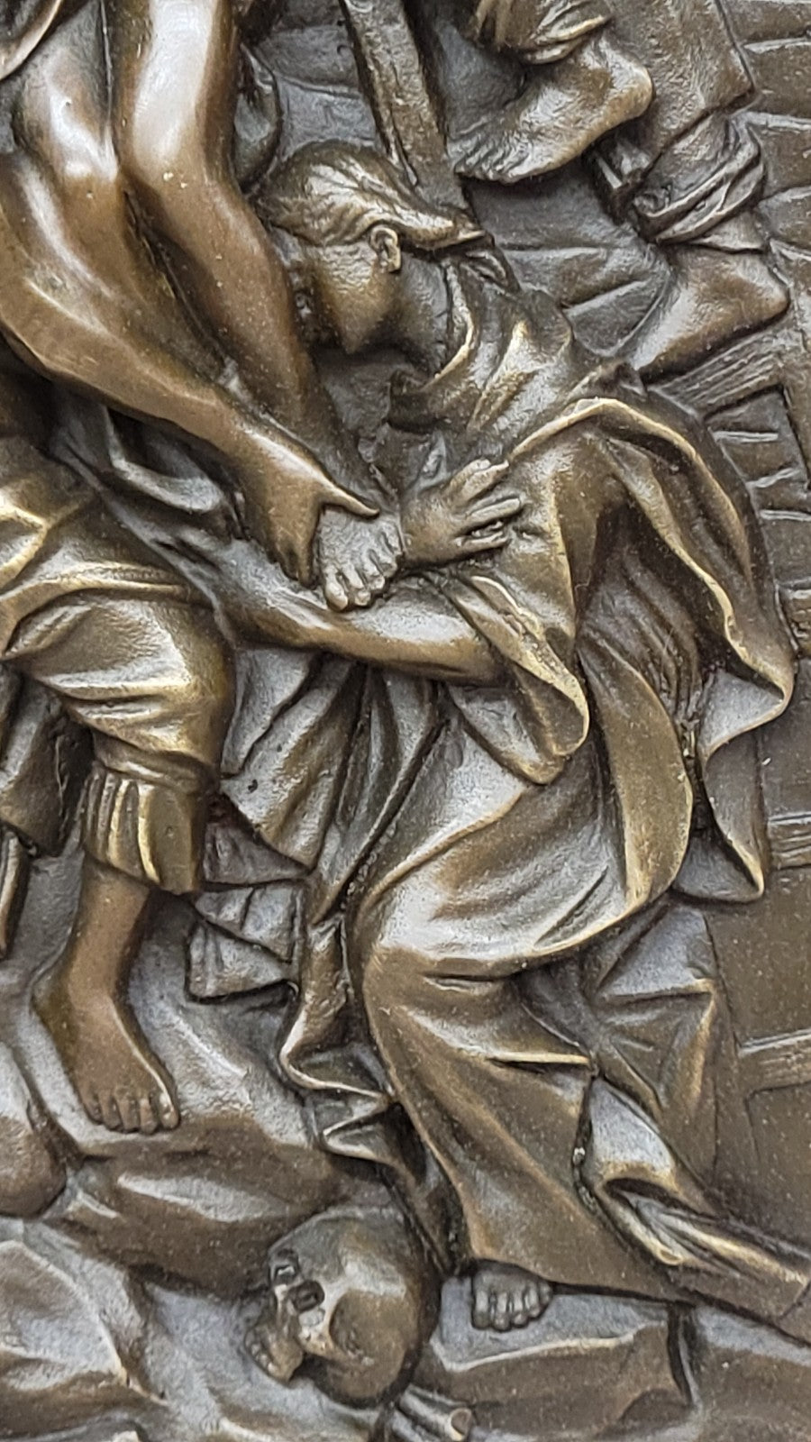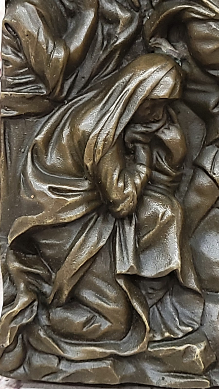 Adding to its authenticity, the sculpture proudly bears the signature of the renowned artist Michael Angelo, who masterfully breathed life into this profound moment. "The Descent from the Cross" serves as an embodiment of faith and the timeless potency of art, allowing viewers to connect with the spiritual and aesthetic dimensions of a pivotal biblical event.