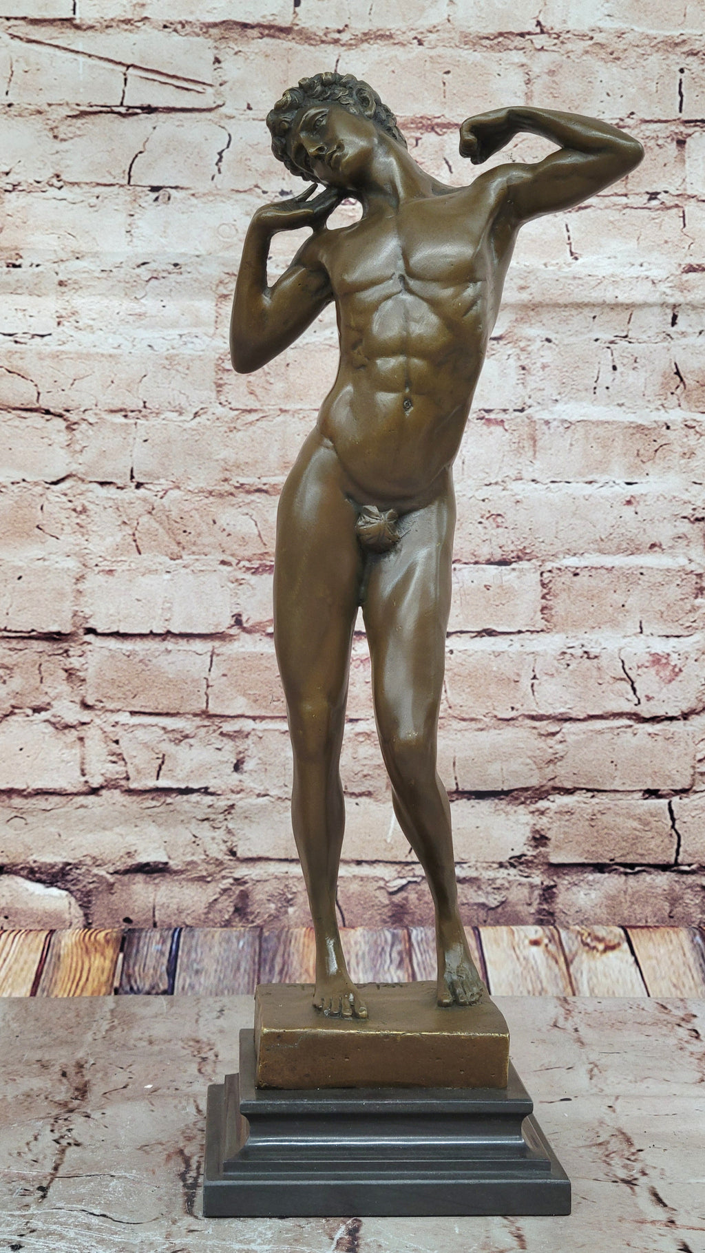 Adorned with the distinctive signature of the renowned artist Michel Angelo, this sculpture is more than a mere representation of the human body; it is a celebration of the exquisite harmony between form and emotion, inviting the observer to delve into the intricate nuances of the human experience. With every meticulous detail and graceful contour, the sculpture serves as a testament to the profound artistry that resonates within the realms of both classical and contemporary sensibilities, making it a cherished addition to any discerning collector's repertoire.