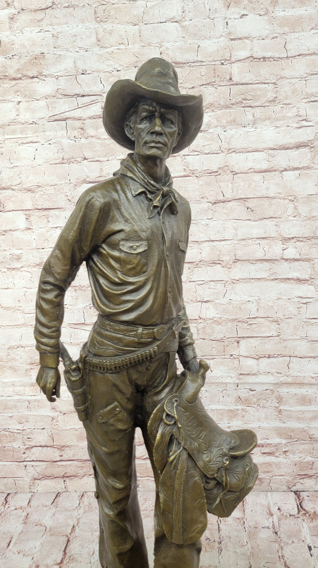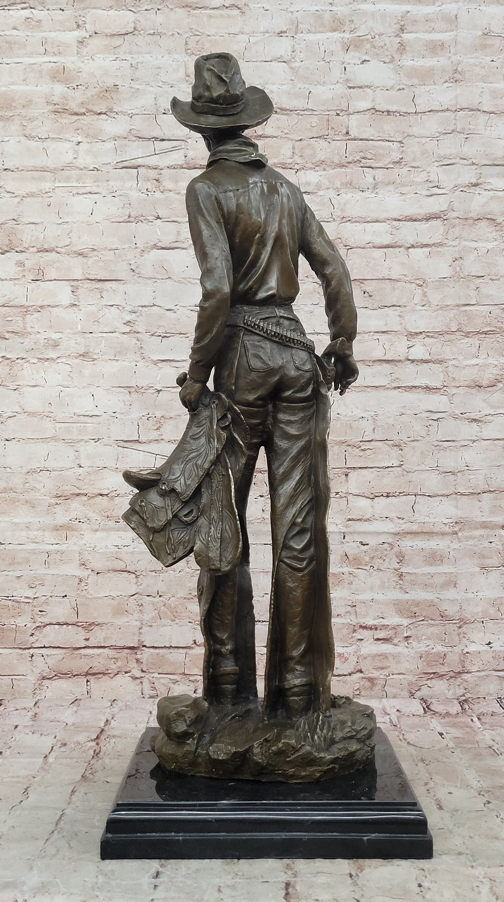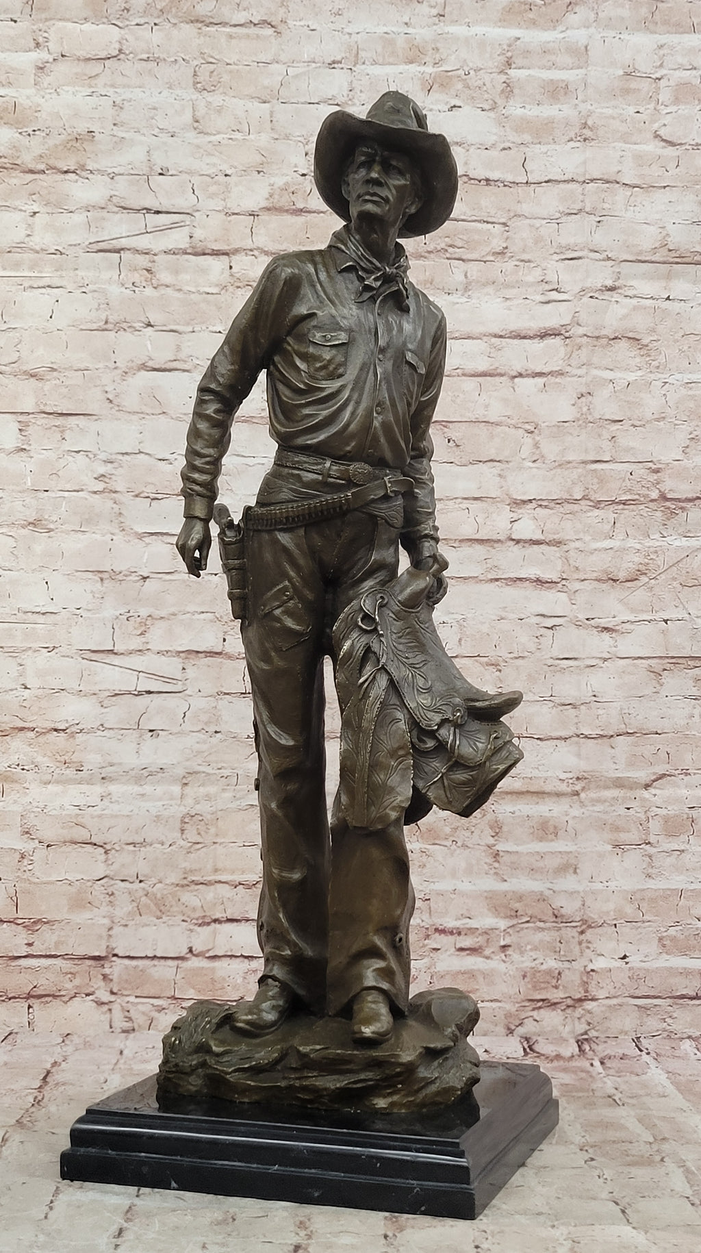 This captivating bronze sculpture captures the rugged spirit of the American cowboy, embodying the essence of life on the open range. The cowboy stands tall, with a confident stance, his iconic cowboy hat resting firmly on his head. The hanging tassels on his jacket and the necklace around his neck add a touch of authenticity to his rugged appearance. In his left hand, he holds his saddle, a symbol of his readiness for the challenges of the trail, while his boots are partly covered by his jeans, showing the wear of a hard day's work.