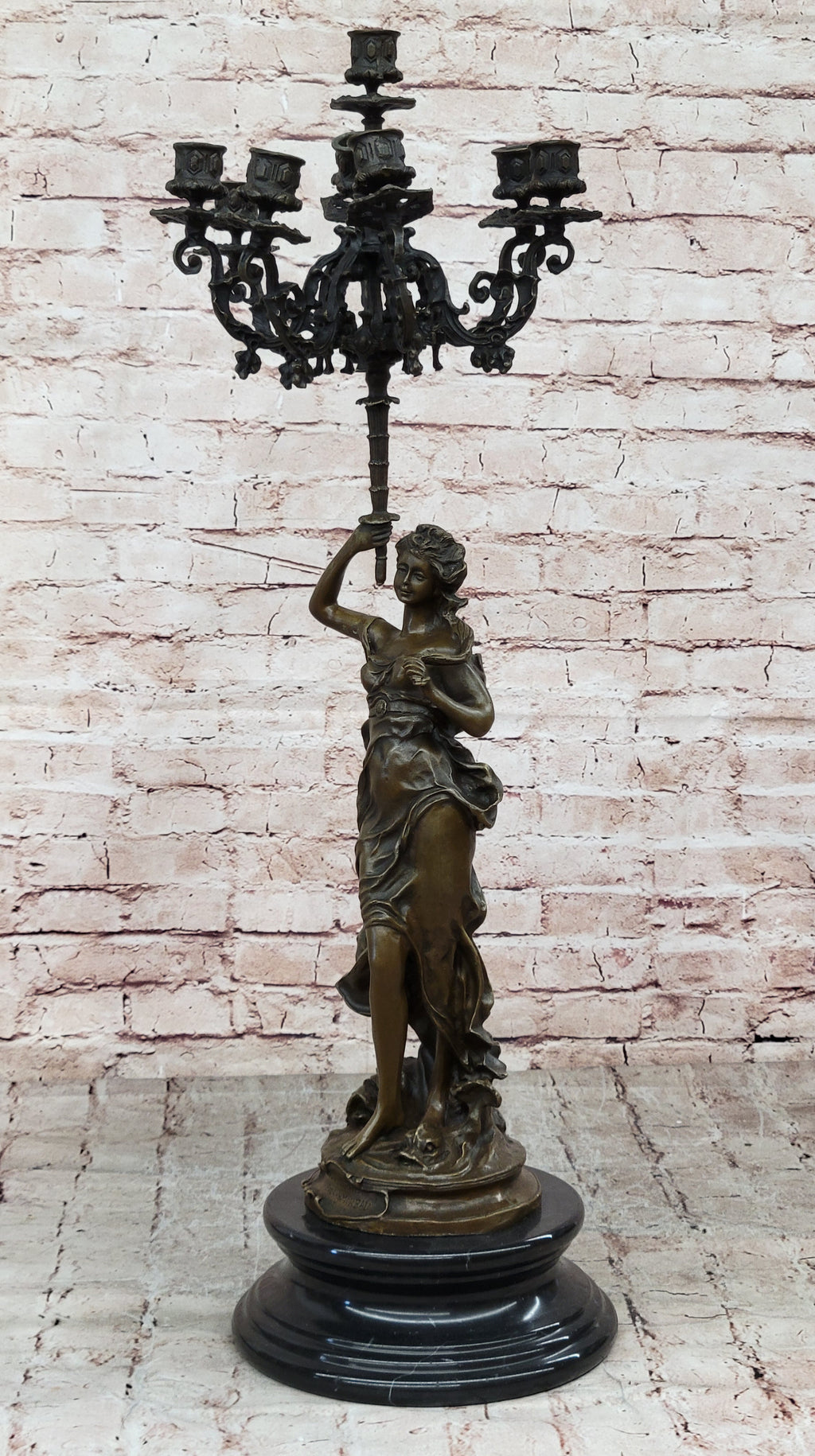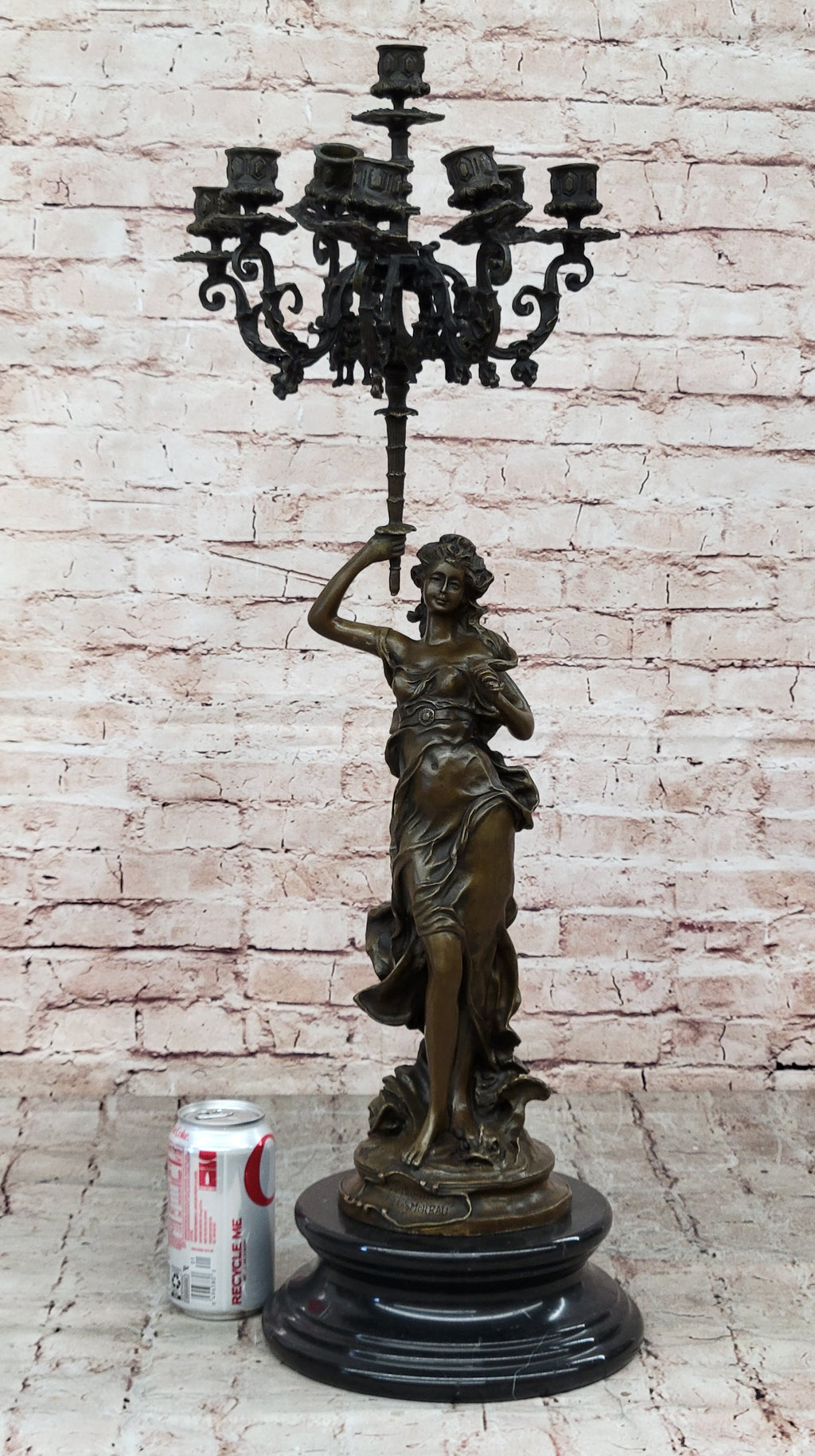 Each candelabra is a masterpiece of hand-made art, created using the traditional lost wax method, which ensures the finest quality and authenticity. The round black marble base provides a stable and luxurious foundation, complementing the rich brown patina finish of the bronze sculptures. Signed by the artist A. Moreau, these candelabras bear the mark of excellence and artistic integrity.