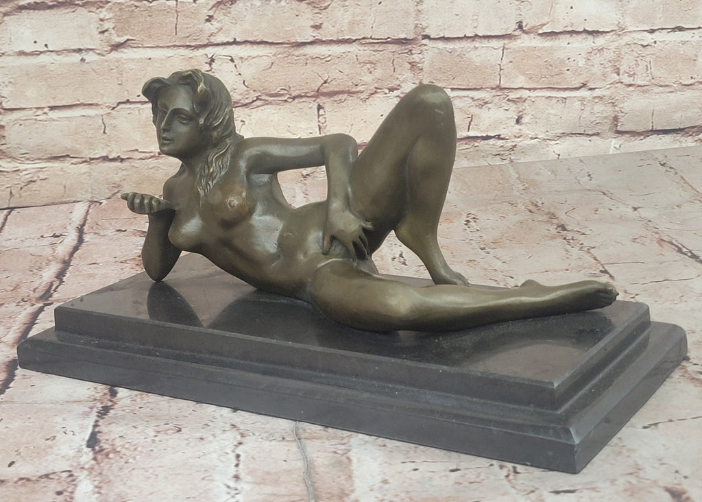 Elevate your collection with this exquisite Adult Art Deco Bronze Erotic Nude Girl Sculpture, a stunning lesbian figure that embodies sensuality and elegance. This captivating bronze statue features a reclining seductress, her right elbow supporting her body while her left hand delicately reveals her allure. With a bent left knee and a mesmerizing gaze, she radiates sophistication and desire, making this piece an unforgettable centerpiece.