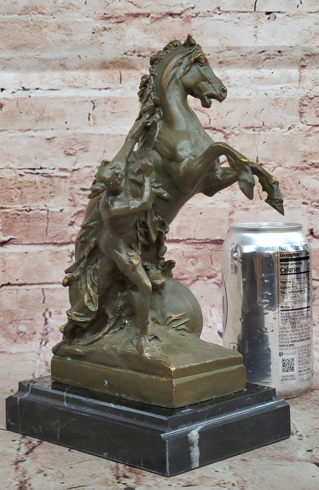 Handcrafted using the time-honored lost wax method, the sculpture features a rich brown patina that enhances the intricate detailing of both figures. From the defined anatomy of the horse to the expressive tension in the man’s stance, Vitaleh’s skillful artistry brings movement and drama to life in solid bronze.