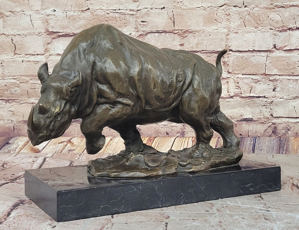 The sculpture is elegantly presented on a black marble base, mirroring the shape of the rock underneath the rhinoceros. This thoughtful design choice adds to the visual appeal and complements the overall composition. The sturdy base ensures stability and enhances the overall aesthetic of the artwork.