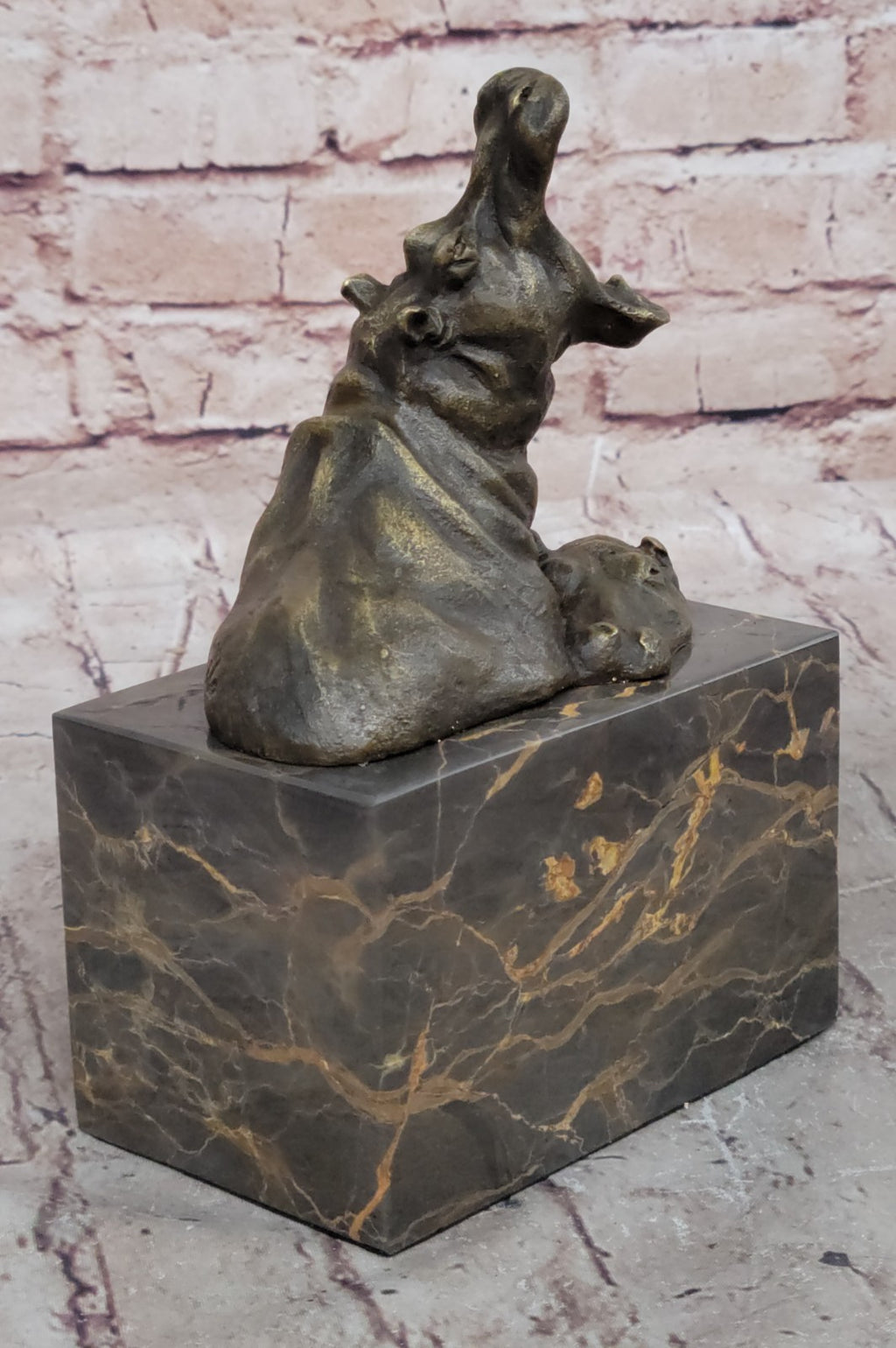 Crafted with precision and care, this sculpture was created using the lost wax method, a process known for its ability to capture intricate details and textures with remarkable accuracy. The result is a lifelike representation of the hippopotamus, showcasing its powerful presence and unique features. Resting gracefully on a brown marble base, this sculpture is not only a testament to artistic craftsmanship but also a striking decorative object.