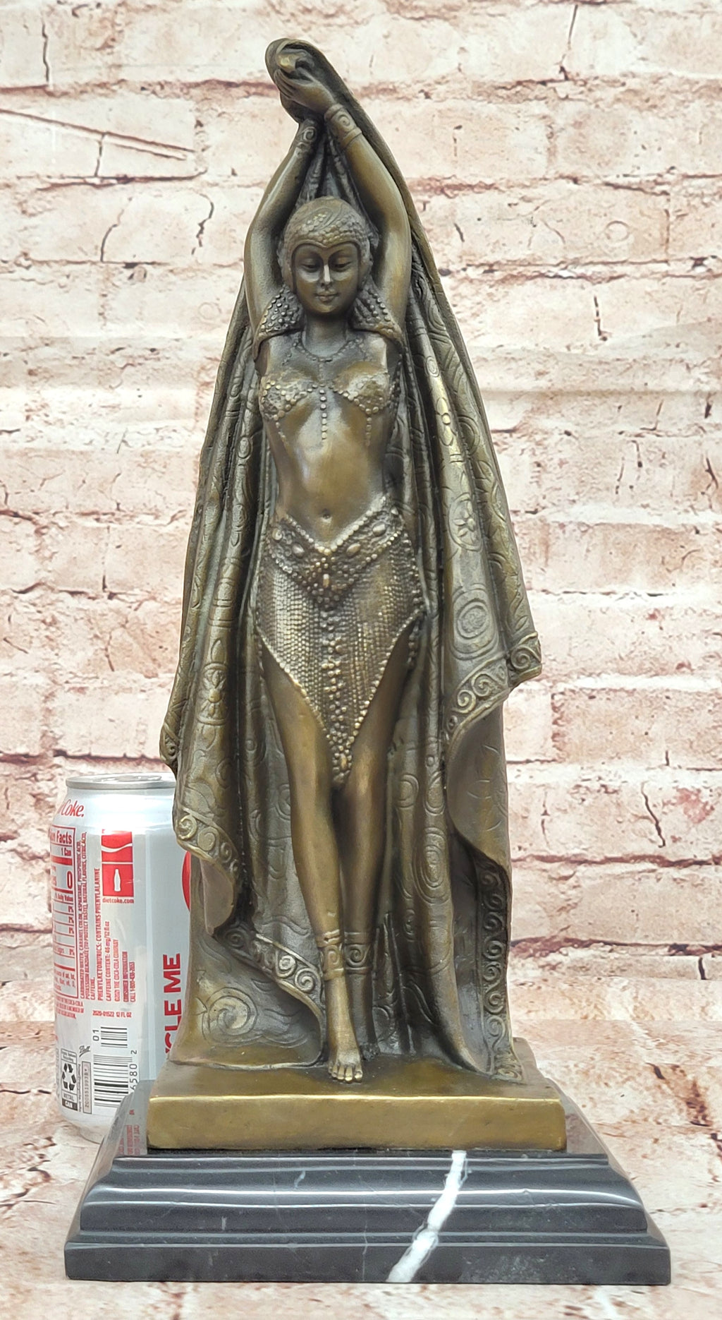 This stunning bronze sculpture, true to the Art Deco period, is the work of the renowned Romanian-born and Paris-trained artist, Demetre H. Chiparus (1886-1947). Known for his elegant and detailed figurines, Chiparus captured the essence of the 1920s and 1930s in his art. This particular piece features a graceful dancer, impeccably cast in designer bronze and set atop a faux marble base. The hand-painted details include Egyptian symbols, reflecting the era's fascination with the discovery of Tutankhamen's tomb, a theme that captivated the world during that time.