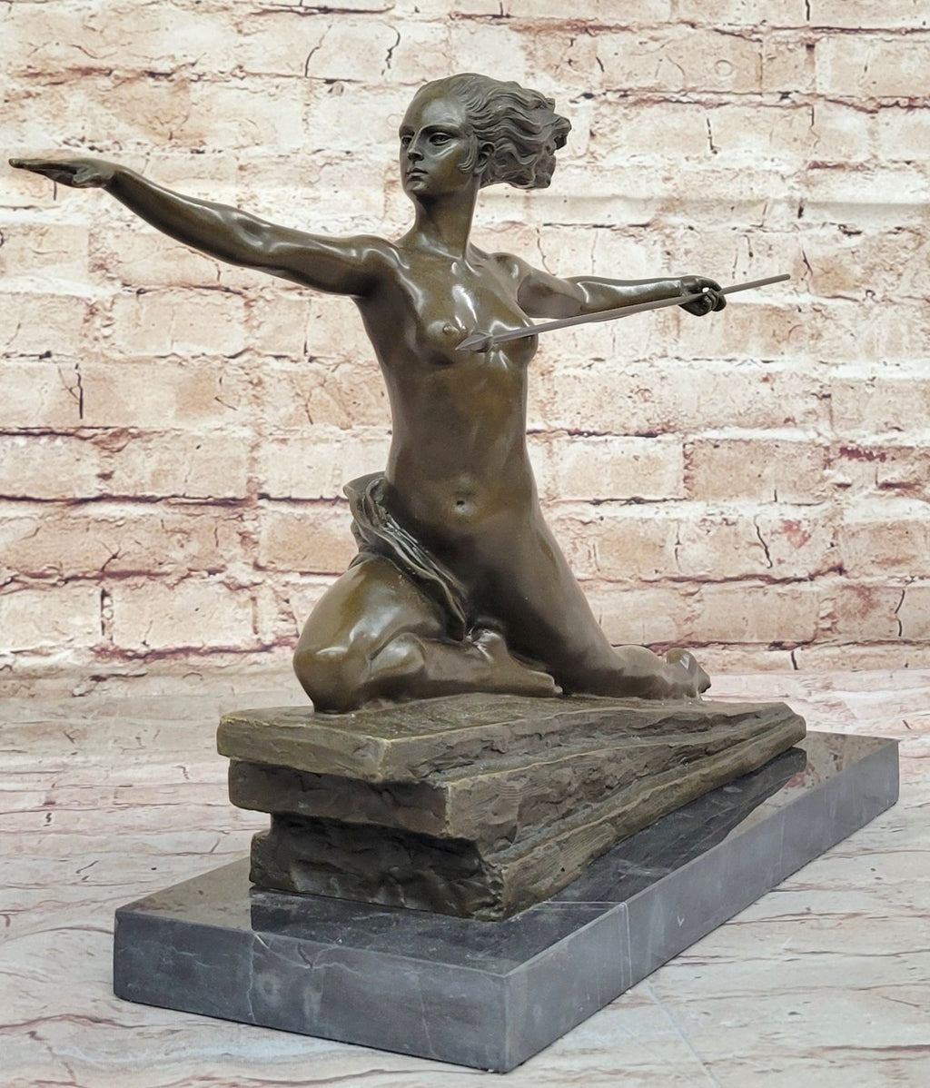 In 1928, Bouraine received a commission from Gabriell Argy-Rousseau, resulting in a series of figurines, including translucent pâte de verre female nudes, a fountain, and an illuminated group. Notably, he undertook major projects for the 1937 Paris International Exhibition, showcasing his versatility with a colored cement low relief for a fountain and an earthenware statue representing ceramics for the Sèvres Pavilion. This French Art Deco Patinated-Bronze Female Amazon Sculpture, crafted after a model by Marcel Bouraine, epitomizes his skill in capturing dynamic and alluring forms.