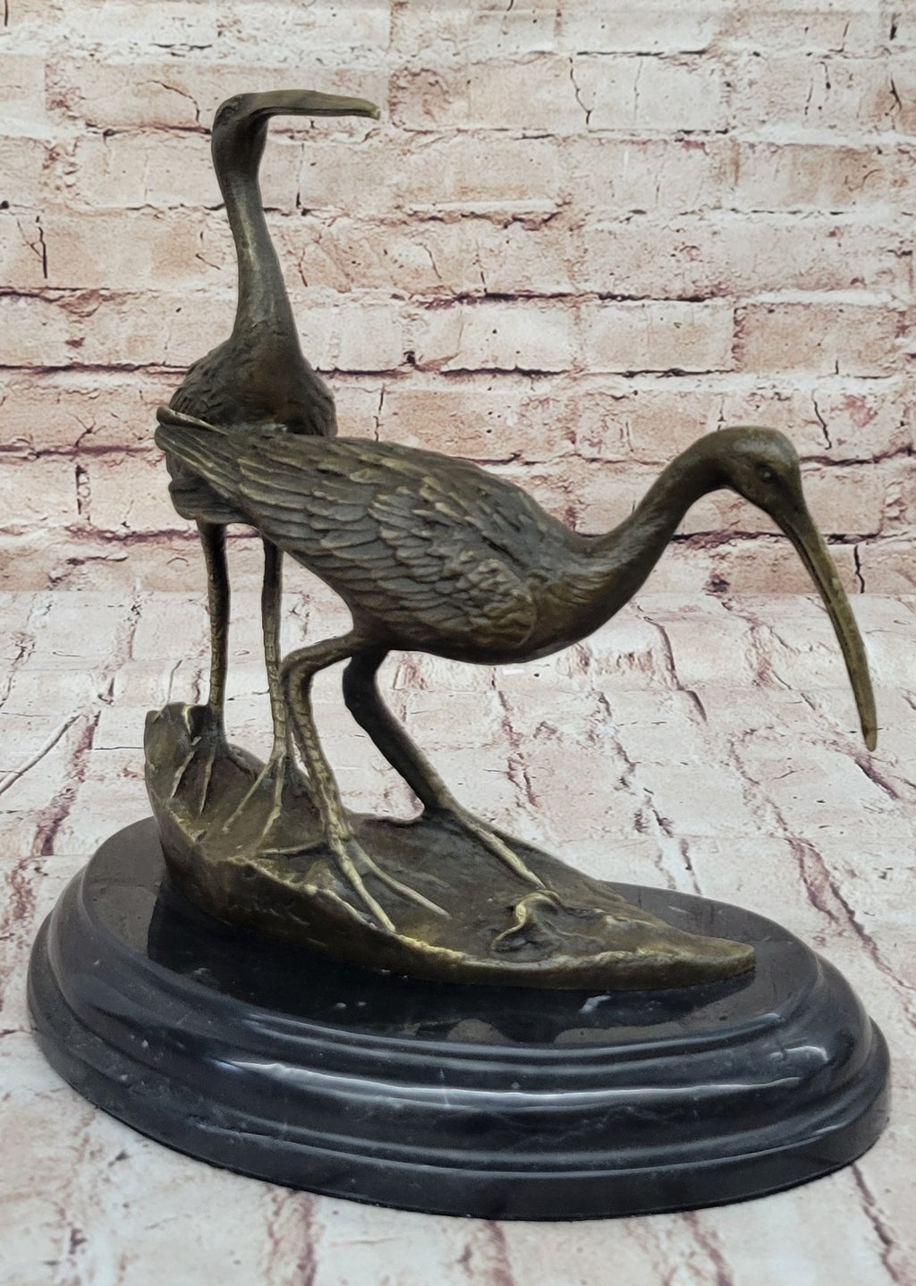 Set on a sturdy black marble base with a rich brown patina, this sculpture stands as a timeless tribute to nature's elegance and the craftsmanship of the artist. Signed by Nick, this bronze statue is not only a remarkable addition to any outdoor space, but also a cherished keepsake that will be admired and enjoyed for years to come. Whether as a focal point in your garden or a centerpiece near your pond, these two cranes exude grace and tranquility, bringing a touch of the wild into your surroundings.