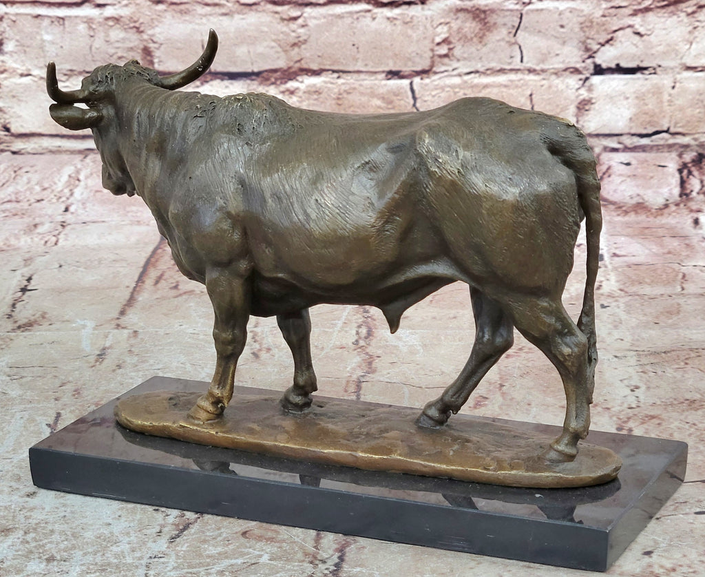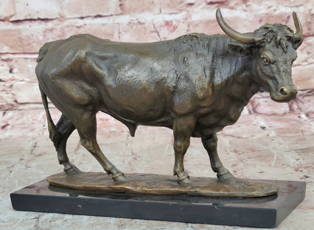 Bulls, as depicted in this sculpture, are known for their dominance and strength, traits crucial in their fights for herd domination. The piece skillfully conveys the robust nature of bulls, showcasing a muscular neck, large feet, and a magnificent bony head. The artist goes beyond a simple representation, incorporating elements like a "mane" of curlier, wooly hair on the neck and head, capturing the unique characteristics of these powerful animals. The sculpture not only reflects the physical attributes of bulls but also their significance in the context of herd dynamics.