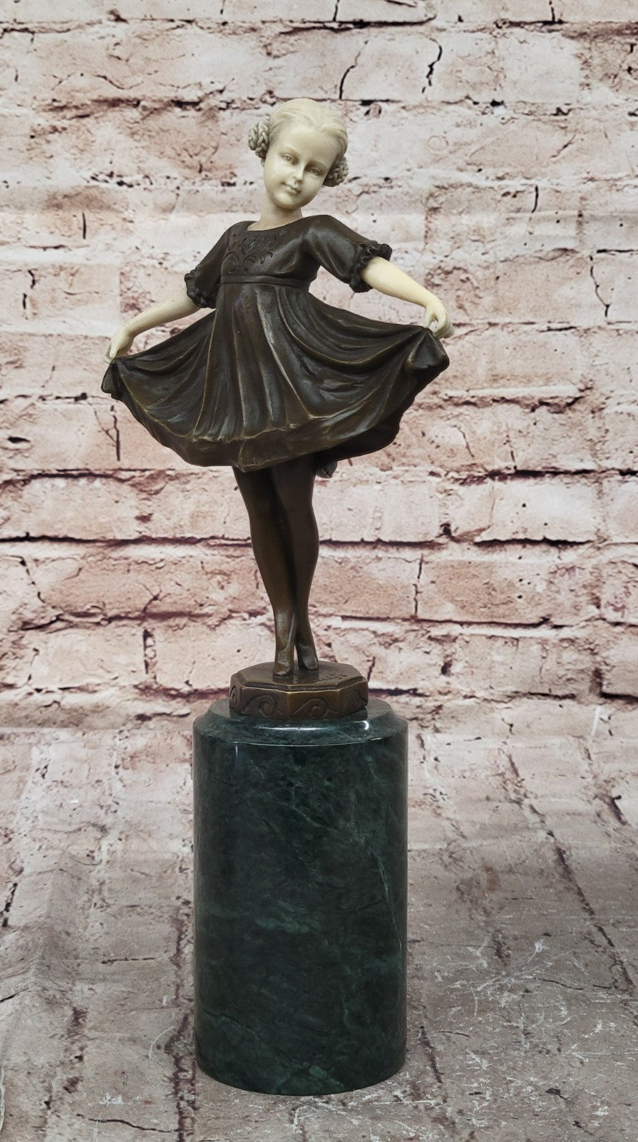 Crafted with meticulous detail using the lost wax method, this bronze sculpture captures the essence of childhood innocence and wonder. Mounted on a black marble base for added sophistication, the sculpture features resin components for the hand and face, allowing for greater precision in capturing the subtle expressions and features of the young girl. Signed by the artist Preiss, this sculpture is a timeless celebration of youth and the joy of performing.