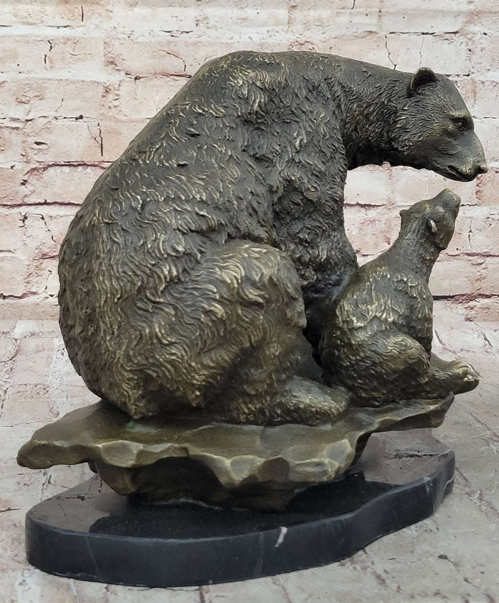 In summary, this sculpture not only celebrates the natural beauty of bears but also conveys the universal theme of maternal love and protection. The artist's meticulous craftsmanship brings the scene to life, making it a touching and timeless representation of the bond between a mother bear and her cub.