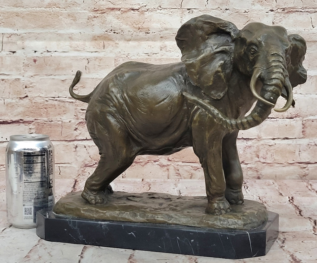 This bronze sculpture masterfully captures the essence of the elephant's grace and significance. Crafted using the time-honored lost-wax casting method, the sculpture is a testament to the artist's meticulous attention to detail. The brown patina finish enhances the texture and adds depth to the artwork, while also serving as a means of preservation. The variegated green marble base upon which the elephant stands provides a harmonious contrast, enhancing the sculpture's overall presentation.