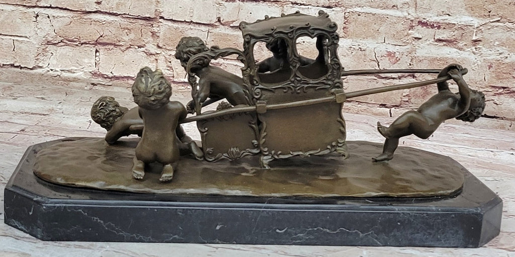 Intricate details of the cherubs and chariot are captured with a rich brown patina, adding depth and sophistication.