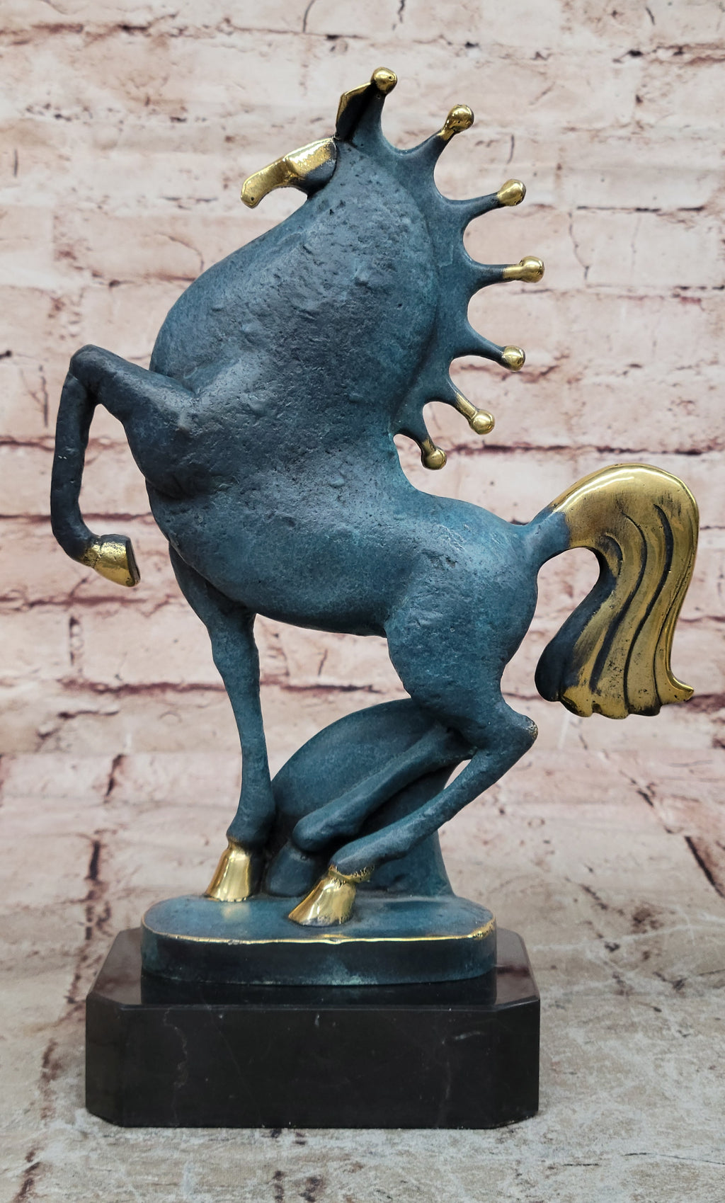 With a seamless blend of history and modernity, the "Signed Original Miguel Lopez Tang Horse Abstract Modern Bronze Sculpture" is a remarkable creation. Through the meticulous lost wax technique, the sculpture pays homage to the Tang dynasty's equestrian art while embracing contemporary abstraction. The sculpture's fluid lines and dynamic form breathe life into the iconic Tang Horse, capturing its essence in enduring bronze. Poised on a sleek black marble base, the sculpture's visual contrast is striking, drawing attention to its remarkable presence. Adorned with a timeless green patina and delicate gold accents, the sculpture emanates an aura of sophistication and craftsmanship. Marked with the signature "Milo," it stands as a testament to the artist's mastery and vision, inviting viewers to engage with the harmonious blend of tradition and modernity captured within its form.