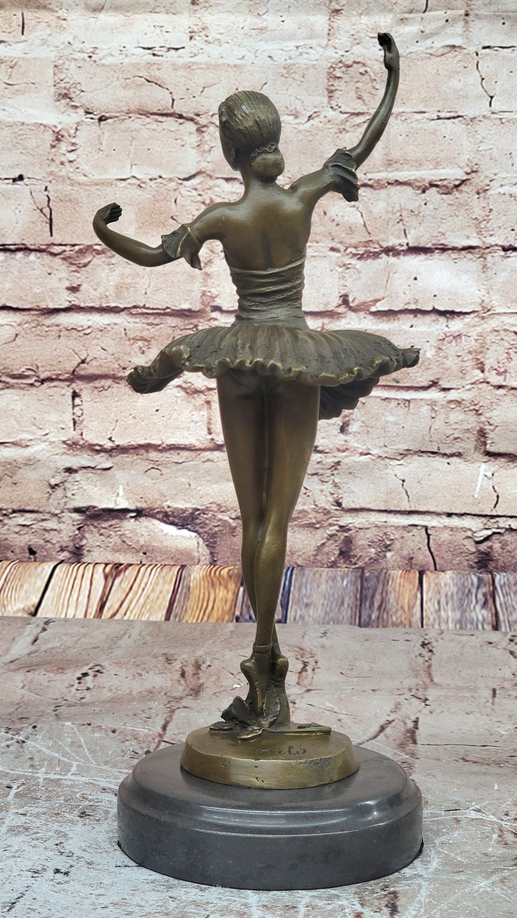 Her hands are expertly crossed above her head, and she delicately balances on her tiptoes, epitomizing the ethereal beauty and precision of ballet. This sculpture is a perfect gift for ballet enthusiasts or those who appreciate the artistry of dance. It was crafted using the age-old lost-wax casting method, ensuring intricate detailing and precision in its design. A rich brown patina stain not only adds a touch of vintage allure but also serves as a protective layer for the sculpture's lasting beauty.