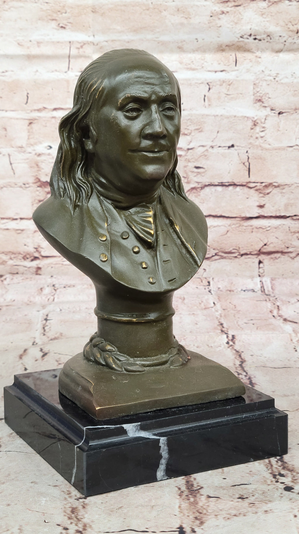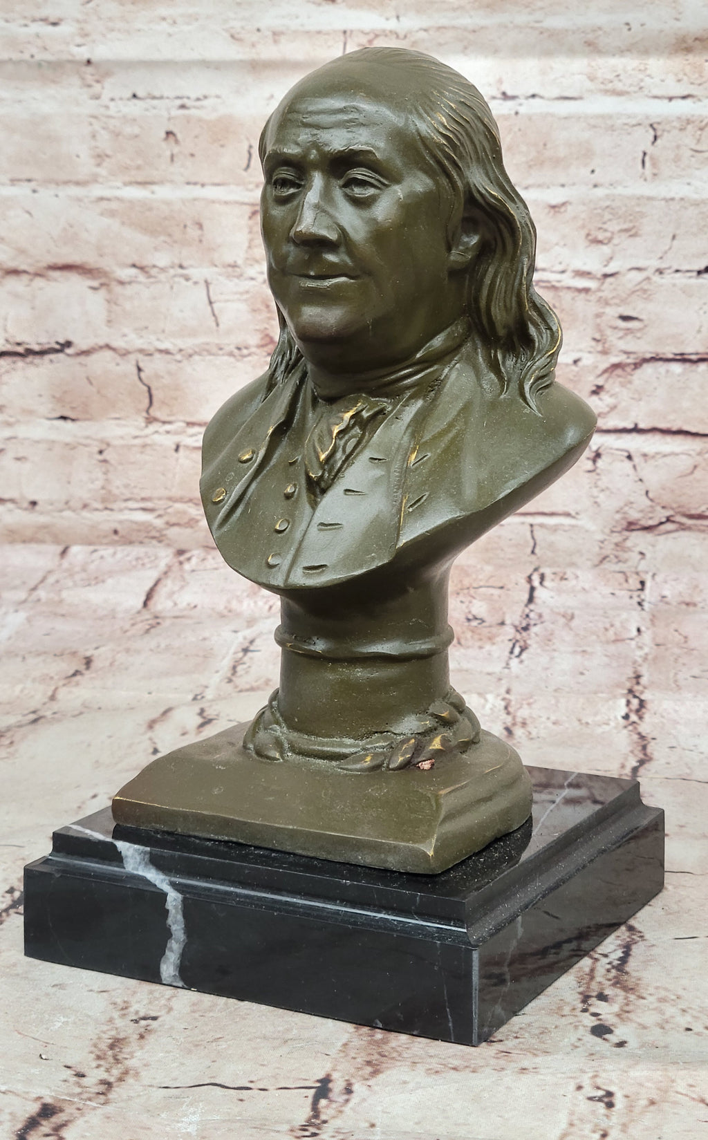 Mounted on a sleek black marble base, the bust exudes both elegance and stability, creating a striking visual contrast that highlights its historical importance. Signed by the artist Fisher, this Benjamin Franklin sculpture is a collector’s treasure, ideal for those who appreciate fine art and wish to celebrate the legacy of an American icon.