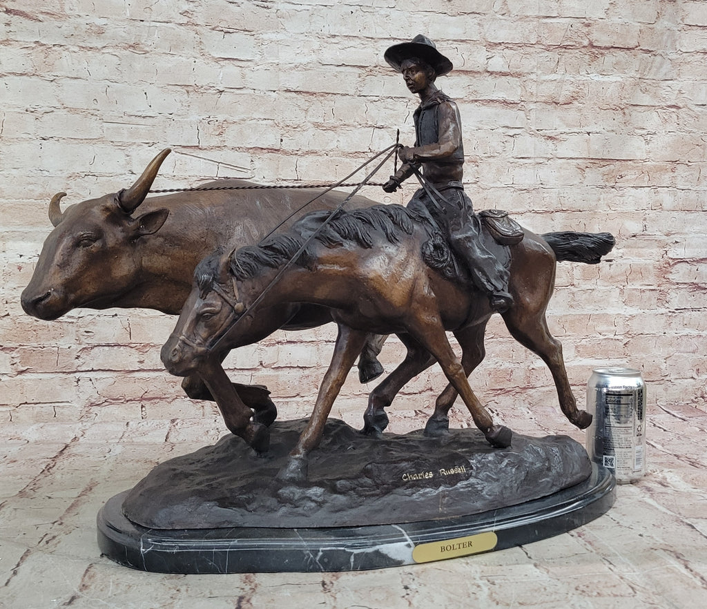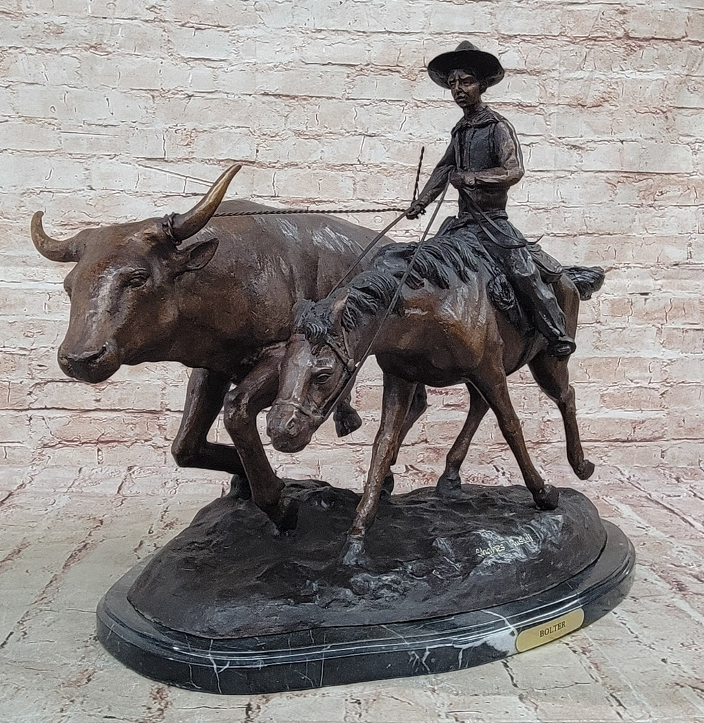 Elevate your appreciation for the heritage and pioneering spirit of the American West with this exceptional bronze sculpture, honoring the unwavering dedication and resilience of the cowboys who shaped the landscape and culture of the frontier. Capturing the essence of the Bolter's relentless pursuit of stray cattle, this sculpture offers a poignant glimpse into the enduring legacy of the American cowboy, serving as a timeless testament to their enduring spirit and the rich history of the Wild West. Whether displayed in a private collection, esteemed gallery, or as a striking centerpiece in your home, this masterpiece stands as a powerful celebration of the undaunted spirit and unwavering commitment of the pioneers who paved the way for the growth and development of the American West.