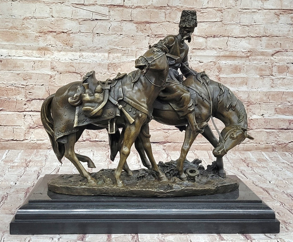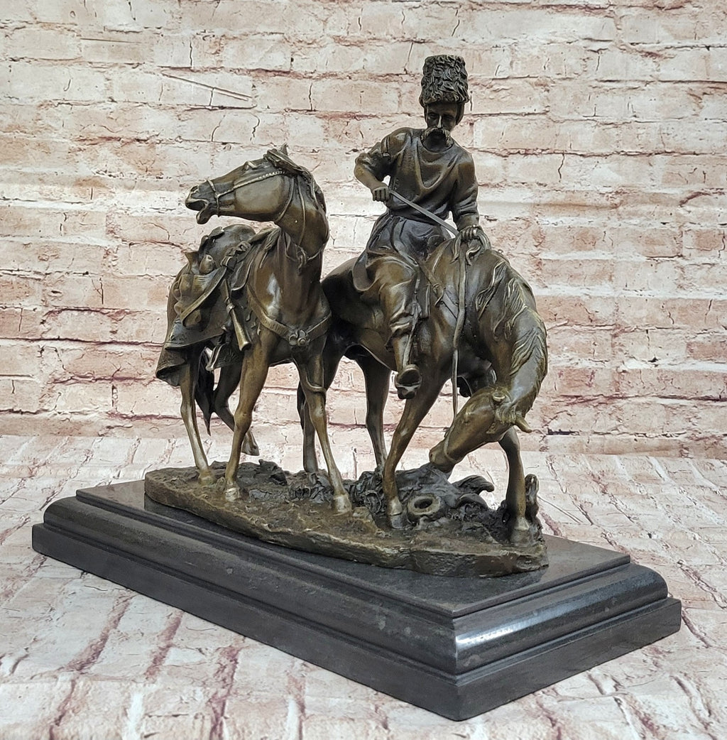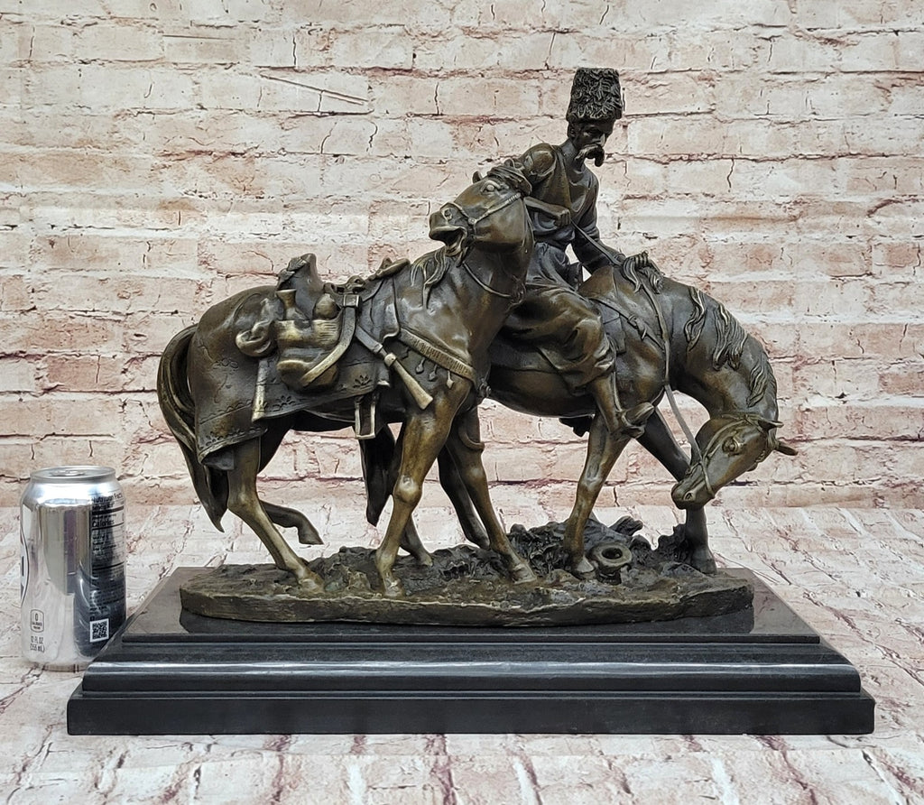 Resting on a rectangular black marble base, this sculpture exudes a sense of grandeur and elegance. The juxtaposition of the Cossack warrior and the Turkish trophy horse creates a captivating visual narrative, inviting you to delve into the historical significance of their encounter.