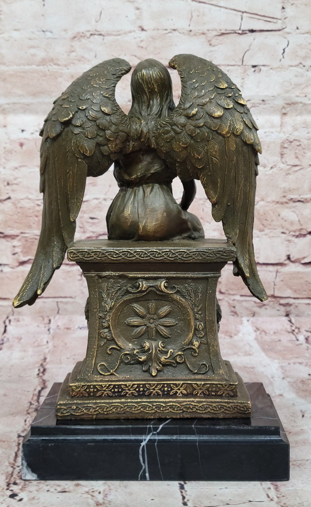 Crafted using the traditional lost wax method, the statue is made entirely of genuine bronze and finished with a rich brown patina that enhances its depth and dimension. Every detail, from the feathers in her wings to the folds in her gown, reflects the skillful artistry and careful craftsmanship involved in its creation.