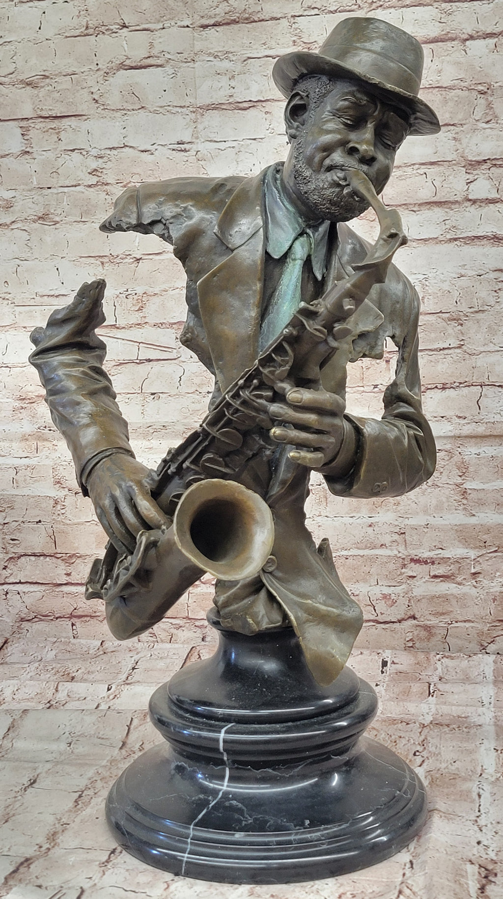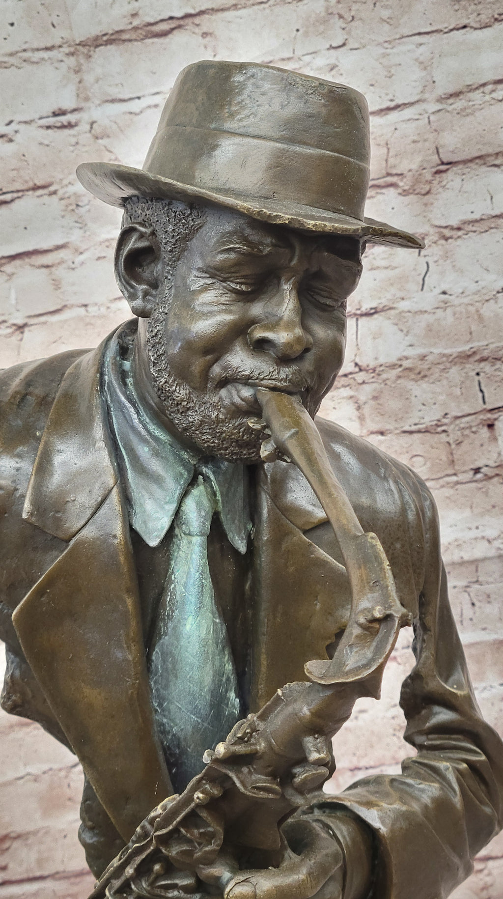 Adorned with a rich brown patina finish that highlights the intricacies of its design, this magnificent figurine exudes a sense of timeless elegance and sophistication, reflecting the enduring legacy and cultural significance of the jazz tradition. Mounted upon a sturdy bronze plinth that gracefully rests atop a sleek black marble base, this exquisite piece serves as a captivating focal point, infusing any room with a vibrant sense of musicality and artistic expression. Bearing the unmistakable signature artist , this masterful creation stands as a timeless testament to the enduring power of music and the profound impact of its melodic influence within the realm of artistic expression.