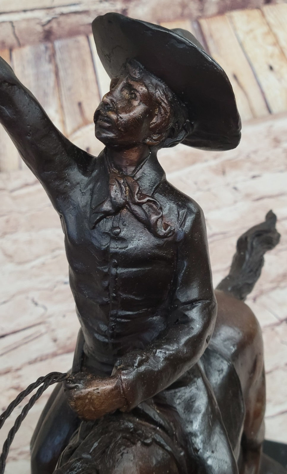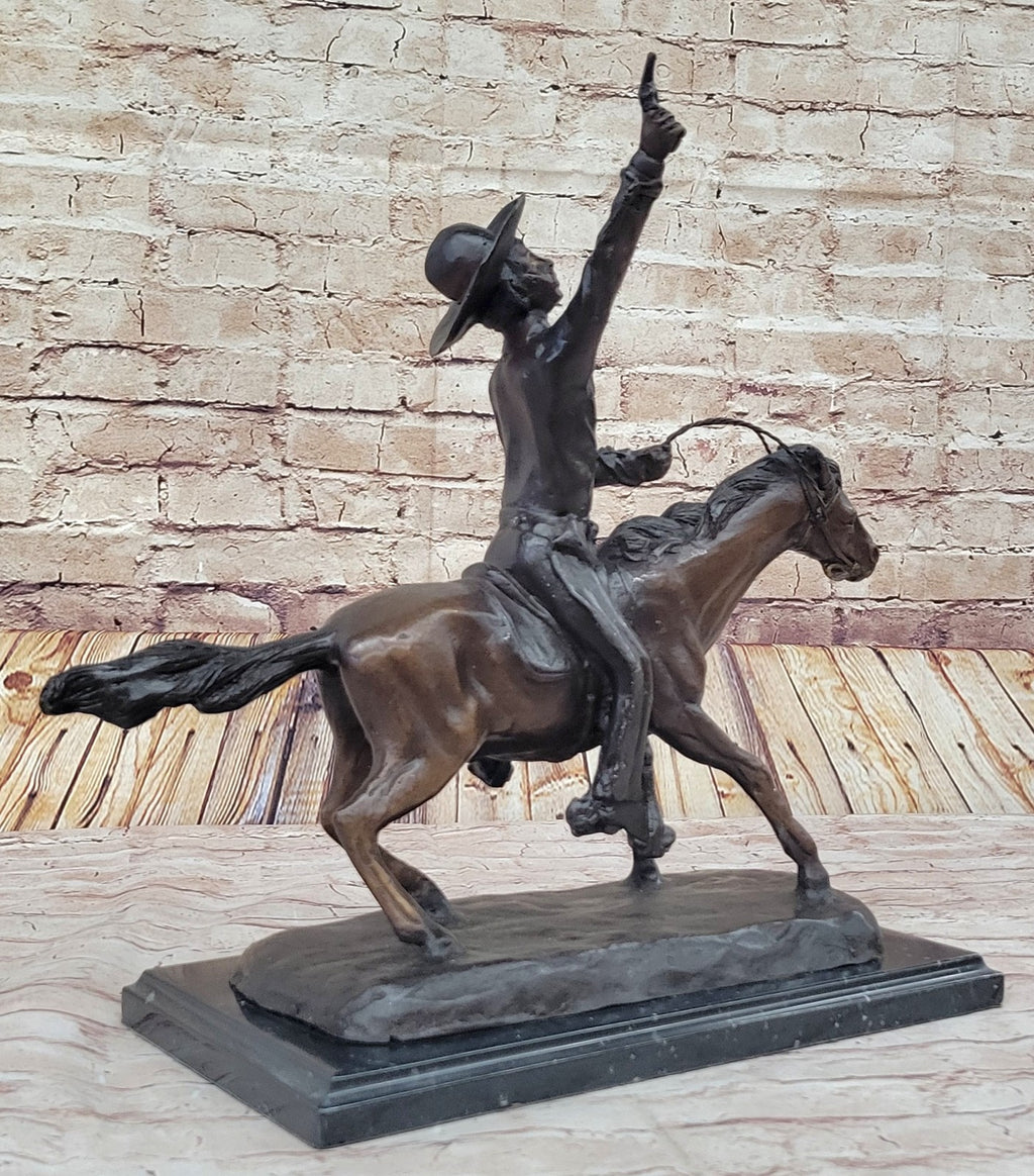The solid marble base further enhances the sculpture's allure, providing a stable and elegant foundation for this captivating work of art. Adorned with a plate featuring the artist's name and an engraving of the statue itself, the base not only adds to the aesthetic appeal of the sculpture but also serves as a lasting testament to the artistry and craftsmanship involved in its creation. This carefully curated combination of fine bronze artistry and a solid marble base elevates the overall presentation, solidifying the sculpture's status as a cherished and timeless American classic, fitting for any discerning collector or enthusiast of American art.