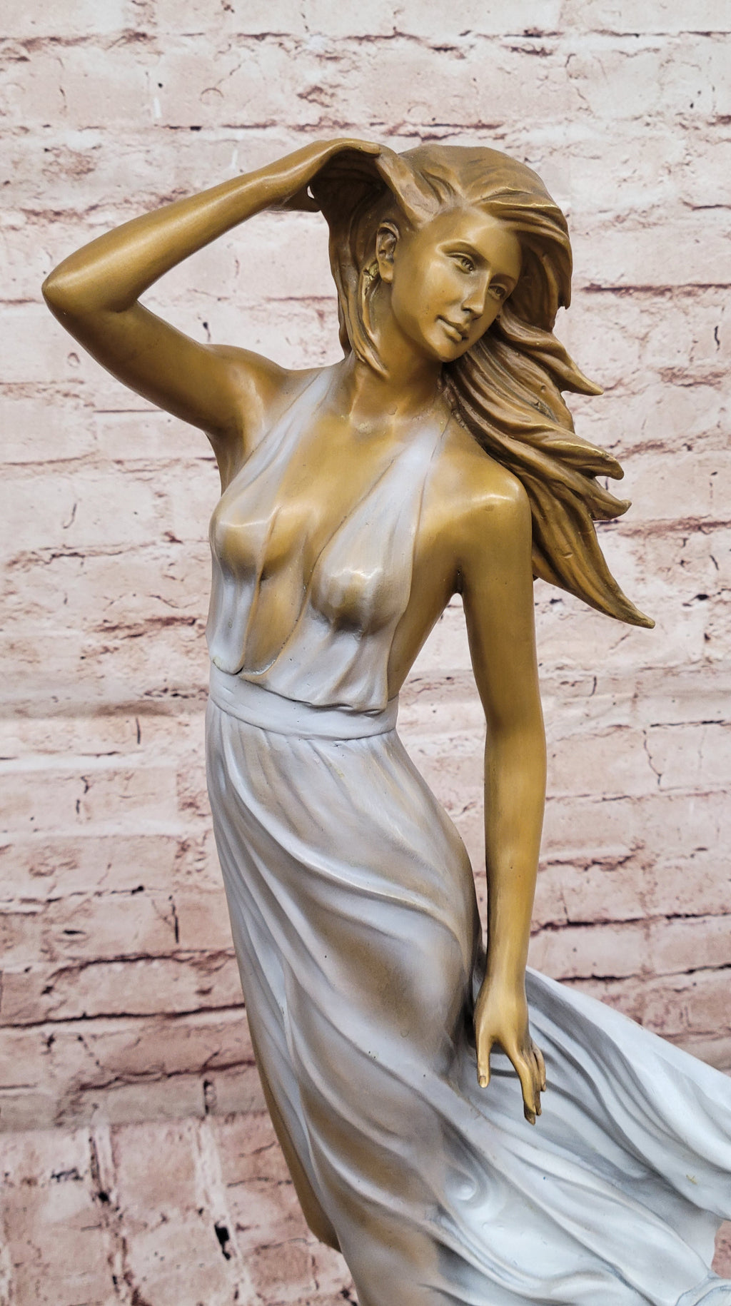 Handcrafted using the lost wax method, this statue showcases intricate detailing, from the delicate folds of her wind-blown dress to the soft expressions on her face. The multi-color cold paint finish enhances the sculpture’s depth, adding vibrancy and realism to the artwork.