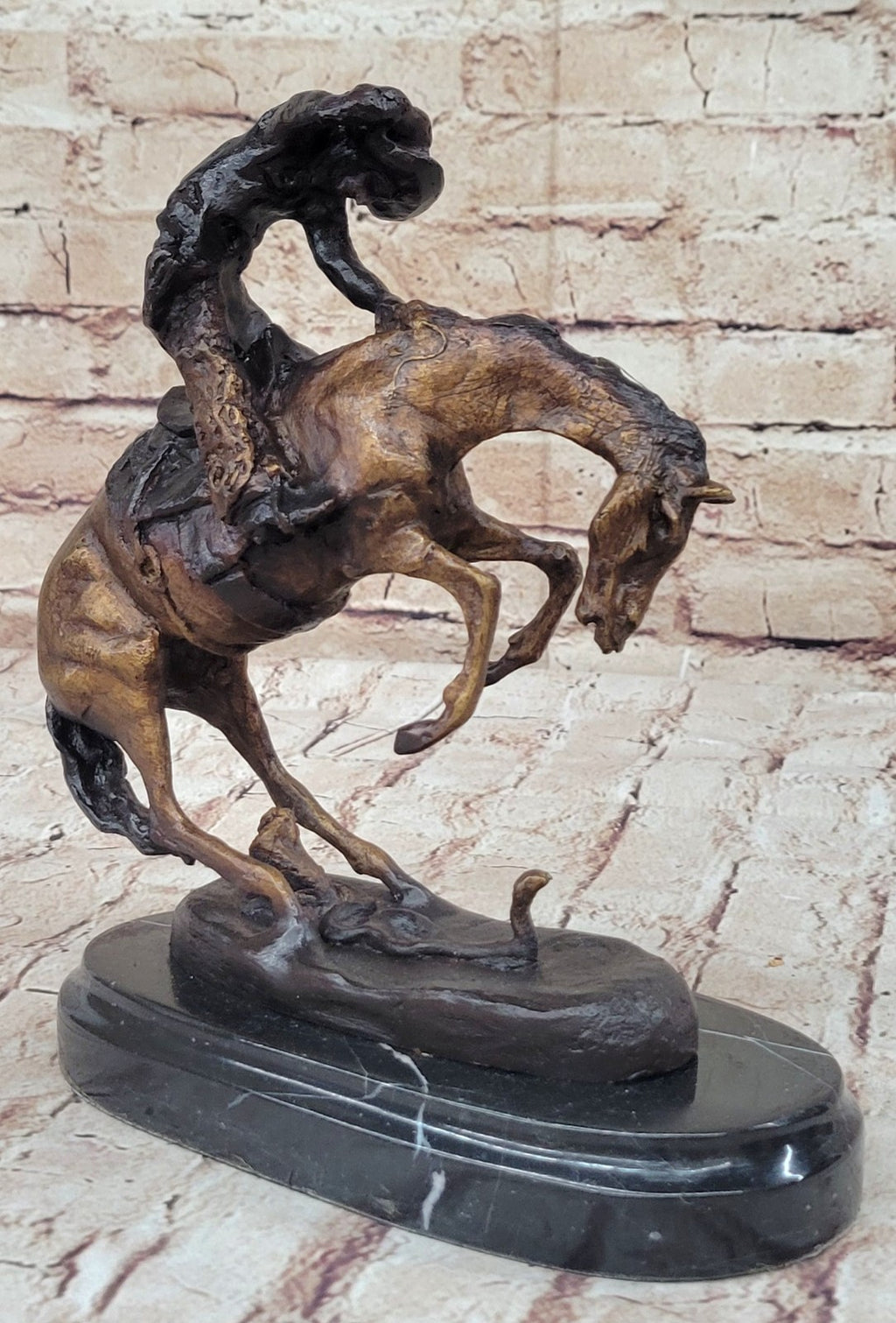 Mounted upon a sturdy base, this statue stands as a testament to Remington's mastery and serves as a captivating centerpiece for any Western-themed collection or decor. Immerse yourself in the untamed spirit of the West and let this striking bronze sculpture transport you to a bygone era of bravery and adventure.