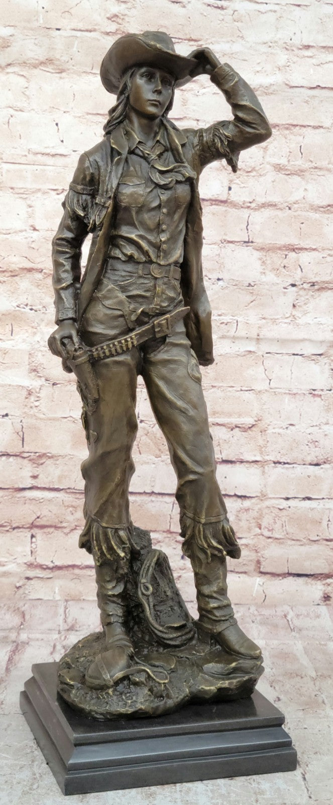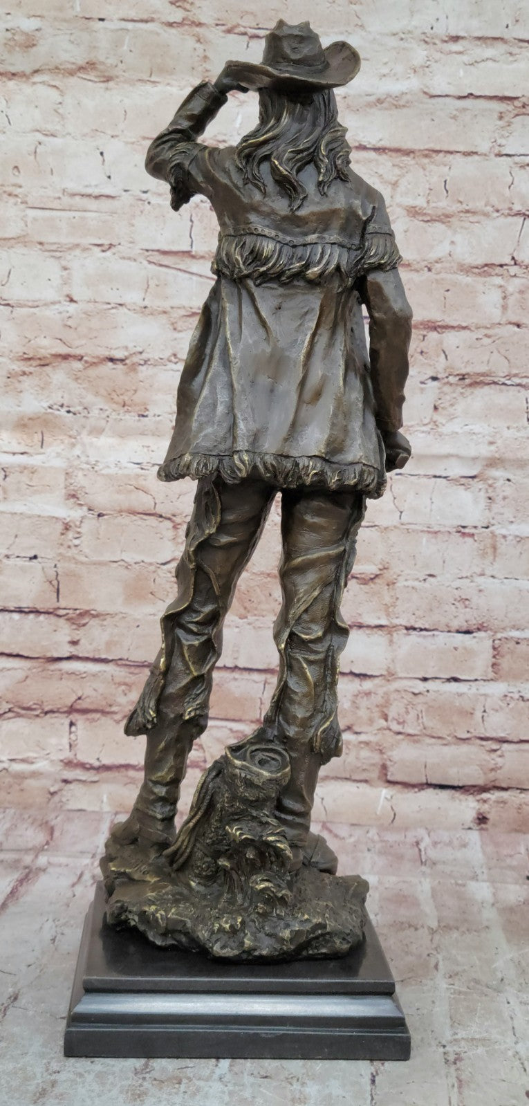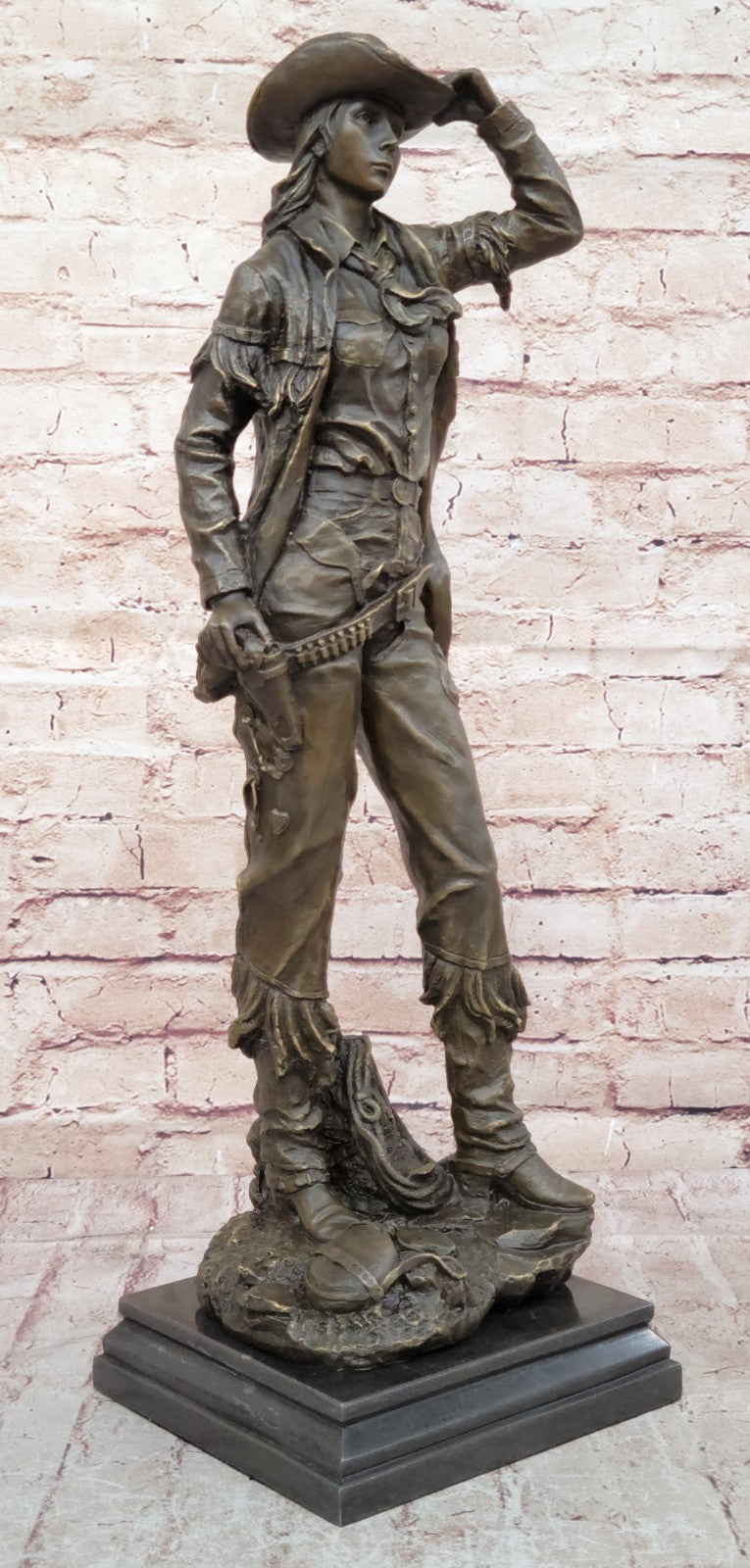 With a firm grip, she holds her gun, her gaze fixed in the distance, capturing a moment of heightened alertness. This exquisitely crafted sculpture encapsulates the essence of the Cowgirl lifestyle with intricate details that captivate the viewer's imagination. Crafted using the renowned "Lost Wax Method," the sculpture showcases the mastery of the artist, Kamiko, and features a rich brown patina.
