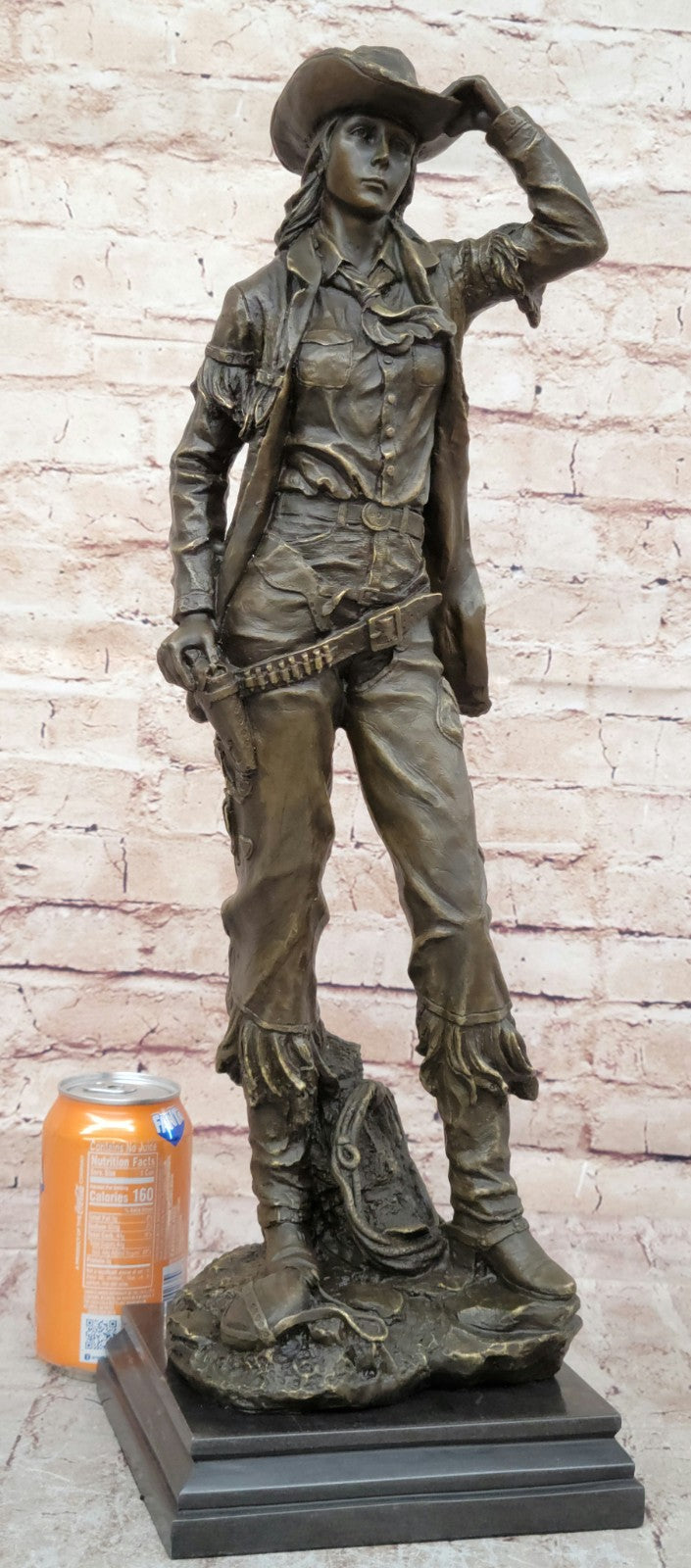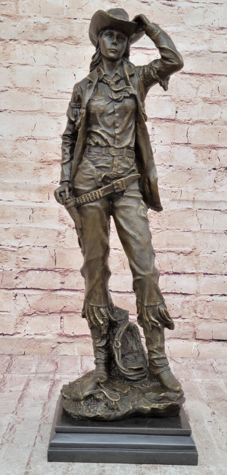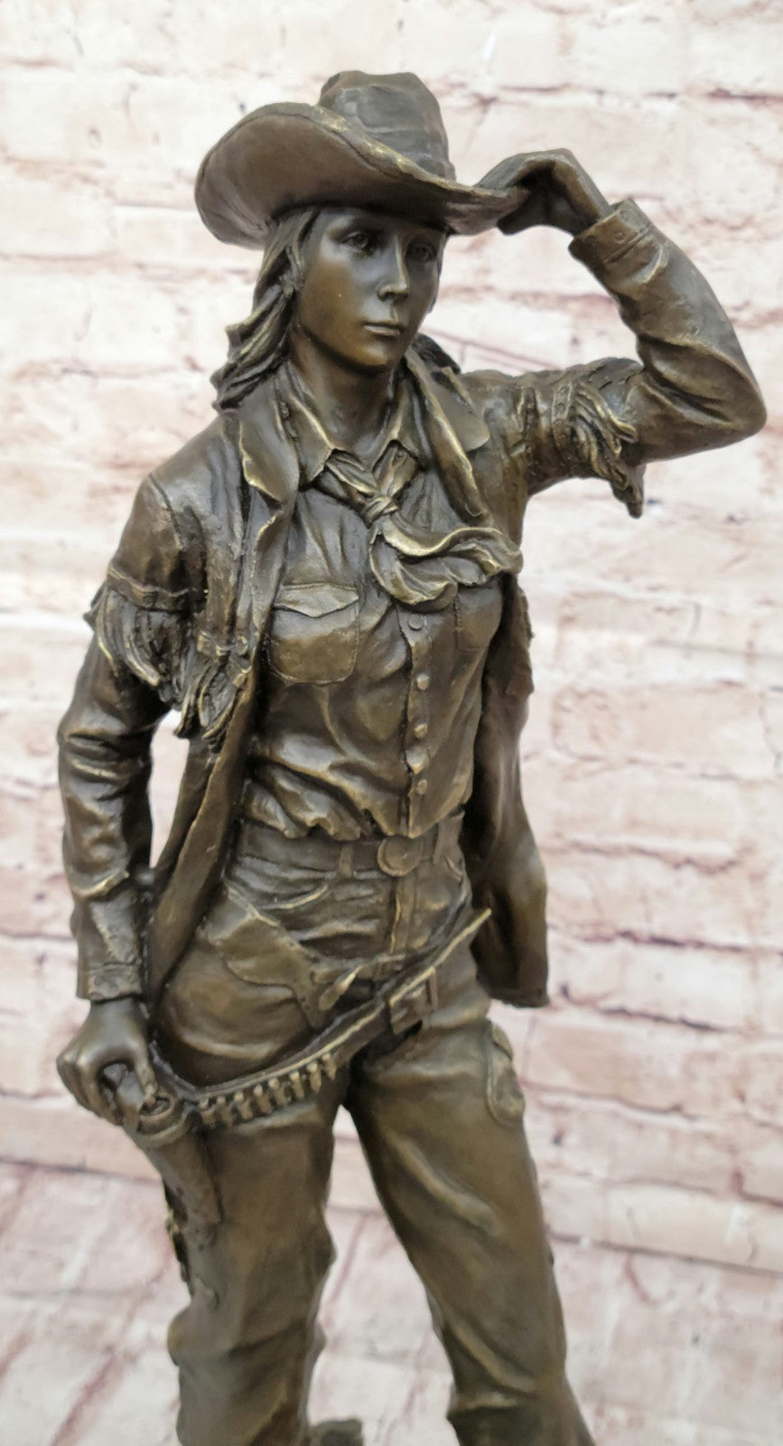 With a firm grip, she holds her gun, her gaze fixed in the distance, capturing a moment of heightened alertness. This exquisitely crafted sculpture encapsulates the essence of the Cowgirl lifestyle with intricate details that captivate the viewer's imagination. Crafted using the renowned "Lost Wax Method," the sculpture showcases the mastery of the artist, Kamiko, and features a rich brown patina.