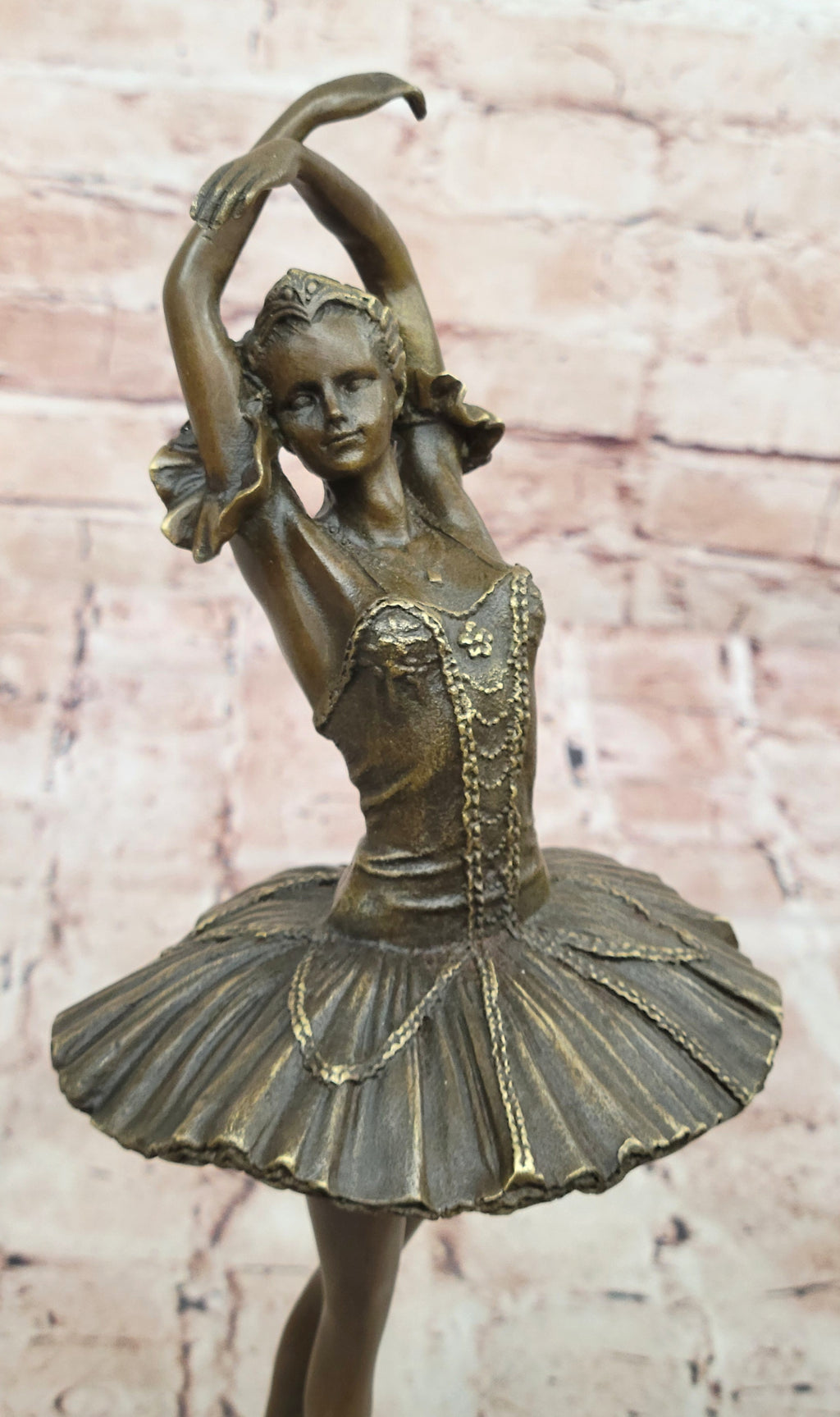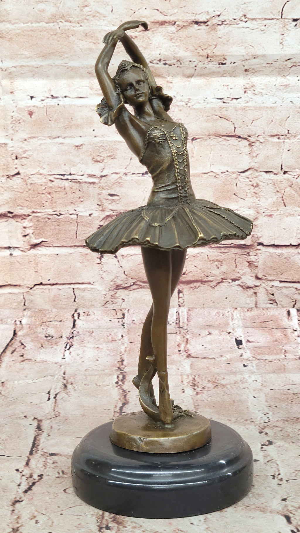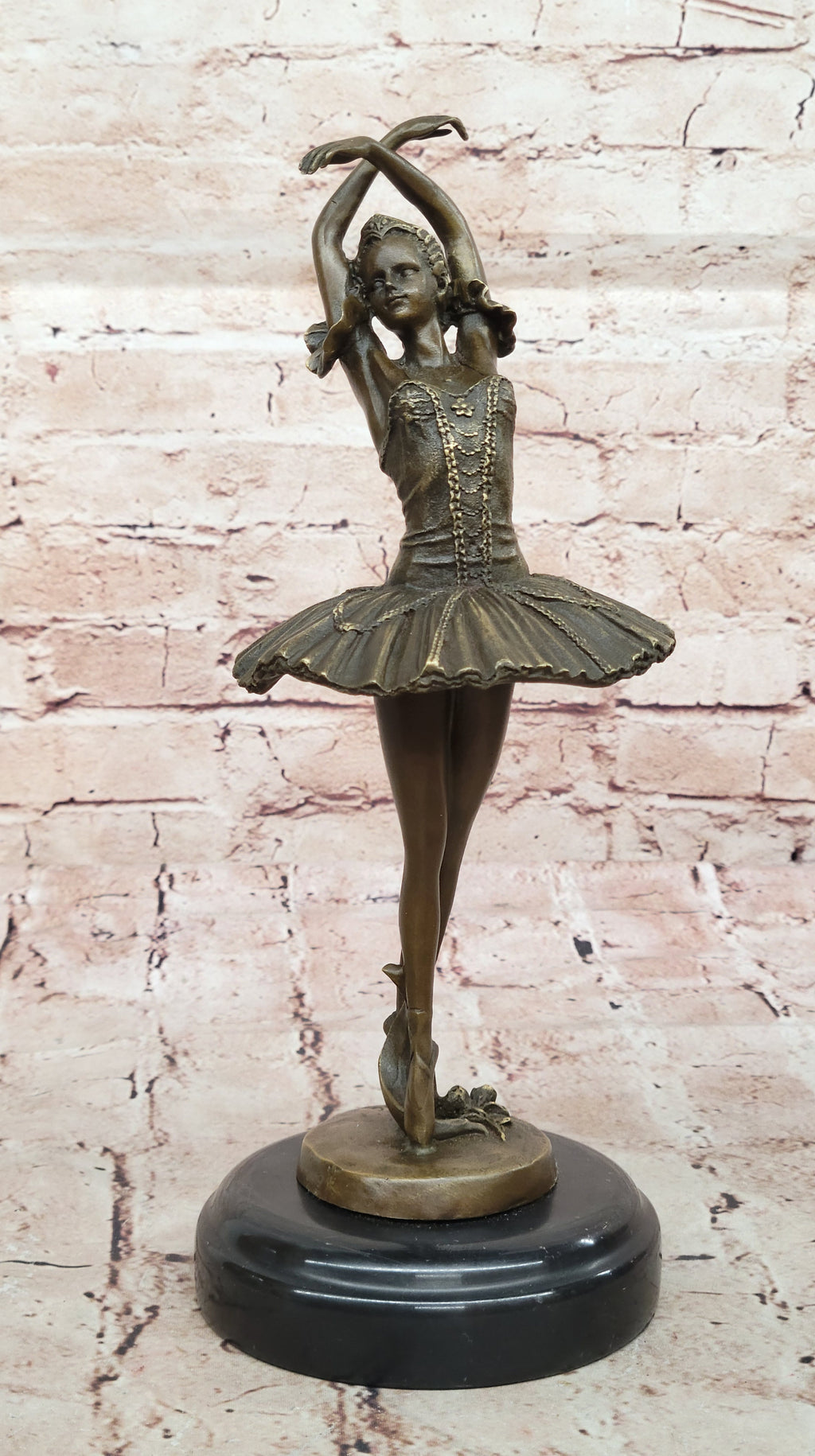 The ballerina's hands are delicately positioned above her head, crossed in perfect form, as she gracefully tiptoes. This sculpture is a perfect gift for any aspiring ballerina or ballet enthusiast, capturing the essence of this timeless dance form. Crafted using the ancient lost-wax casting method, it ensures the highest level of detail and quality. The rich brown patina stain adds depth and character to the sculpture, preserving its beauty for generations to come.