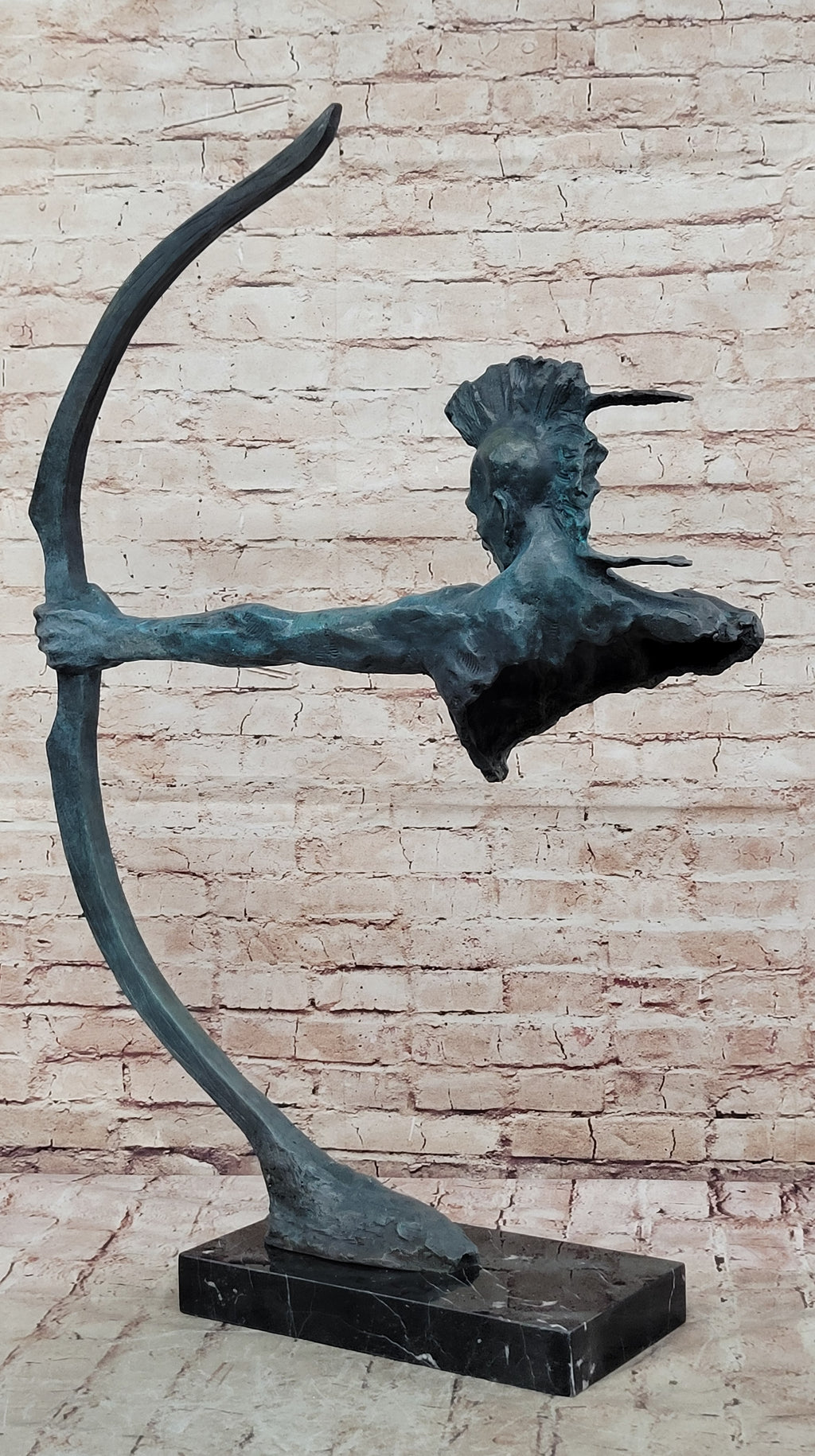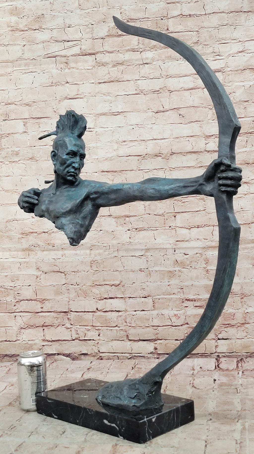 The sculpture depicts a Native American warrior from his right side, his eyes focused on the trajectory of the arrow he has just shot, much like a hawk locked onto its prey. His right hand, pulled back from the release, rests on his chest, while his left arm extends firmly in front of him, grasping his bow, which anchors the sculpture to the base. This dynamic and lifelike portrayal celebrates the warrior's skill and connection with nature.