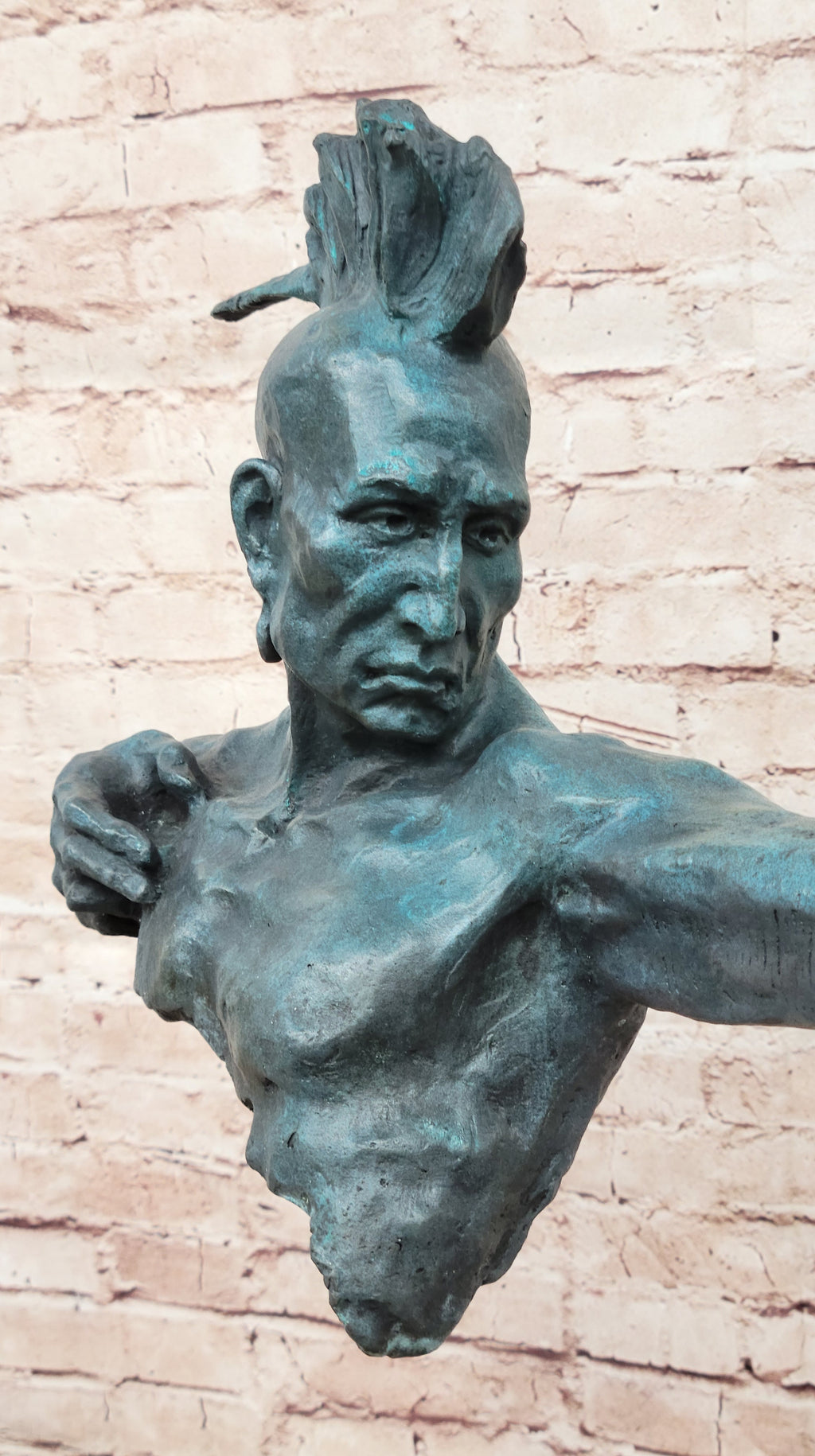 Crafted using the ancient lost-wax casting method, the sculpture preserves the raw authenticity and emotion of the scene. Enhanced with a green patina finish, the artwork adds depth and character, complementing its rich cultural significance. Mounted on a sleek black marble base, the exquisite Native American warrior sculpture proudly bears the signature of the talented artist Nick. A masterpiece that transcends time, this bronze artwork is a captivating tribute to the strength, spirit, and artistry of Native American culture.