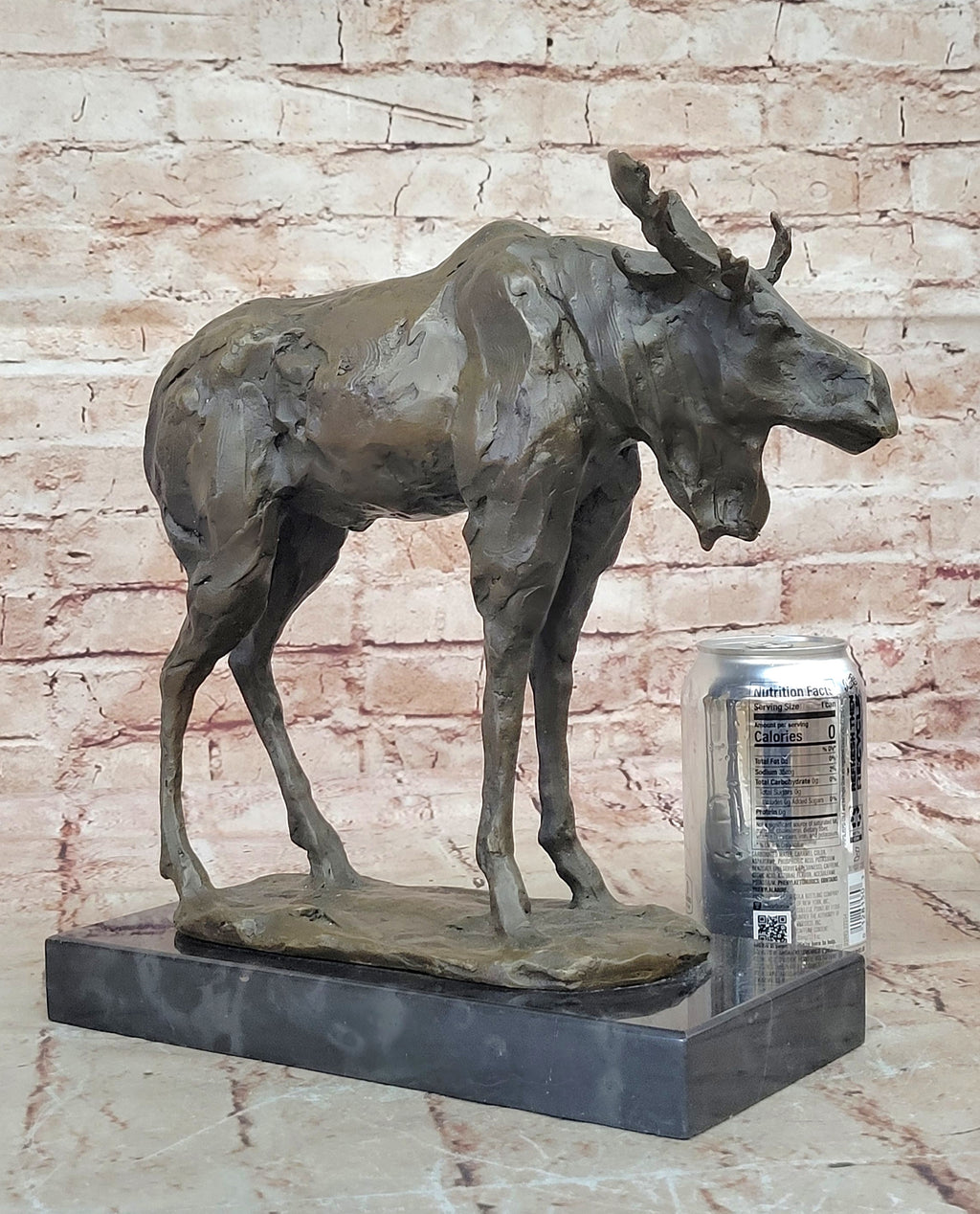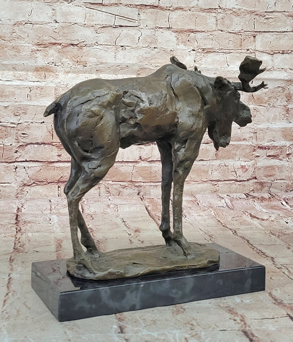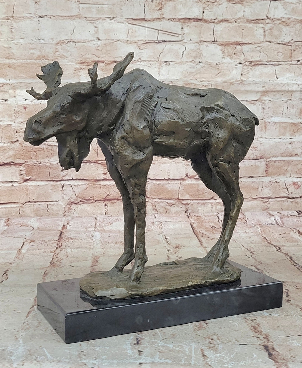 The moose, known as the North American moose or the Eurasian elk in Europe, is characterized by the distinctive palmate antlers of its males. Solitary by nature, these majestic creatures briefly break their solitude during the mating season, which occurs in September and October. The sculpture elegantly captures the moment of stillness in the deep forest, where the bull moose stands with an aura of majesty, breaking the silence with its resonant grunts that can carry for up to 500 meters.