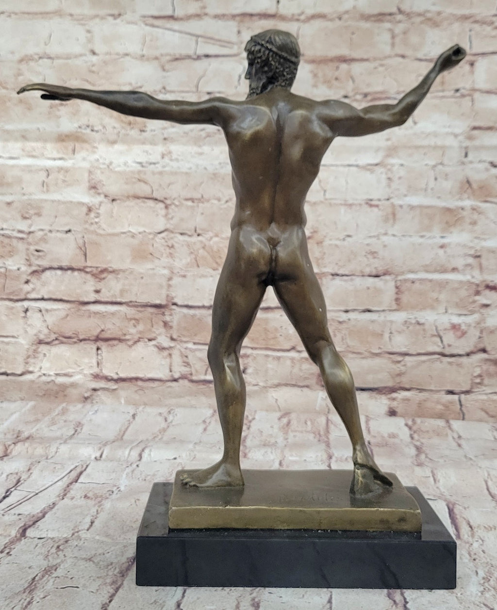 Crafted with precision, this sculpture is a testament to the traditional artistry of bronze casting. Using the "Lost Wax Method," each detail of Poseidon’s form is faithfully reproduced, ensuring the sculpture’s authenticity and quality. The rich brown patina adds depth and character to the piece, highlighting the intricate details of his body and expression. Mounted on an elegant off-white marble base, the sculpture is signed by the renowned artist Praxiteles, affirming its value and craftsmanship. This remarkable piece stands as both a striking work of art and a profound representation of Poseidon’s legendary power.