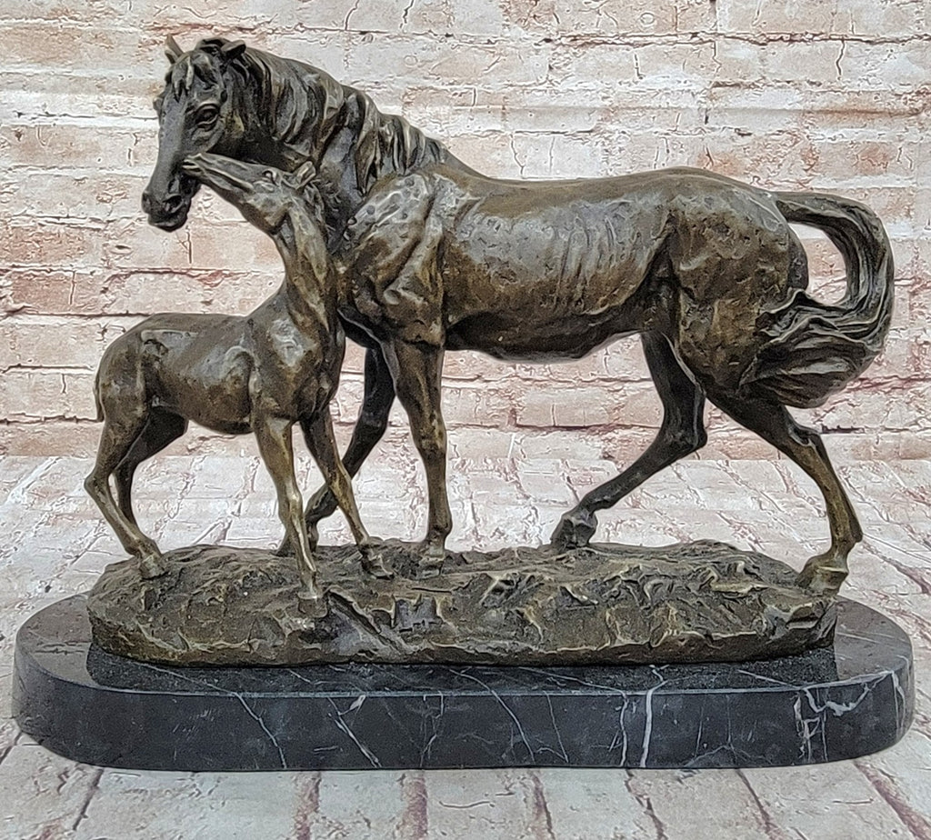 With its rich symbolism and masterful craftsmanship, this handmade bronze sculpture invites contemplation of the deep connection between humans and horses throughout history. Beyond its aesthetic beauty, the artwork serves as a poignant reminder of the diverse meanings associated with these majestic animals and their enduring impact on human civilization. Displayed upon the black marble base, this sculpture becomes a striking focal point, capturing the essence of the bond between mare and foal in a timeless and captivating form.