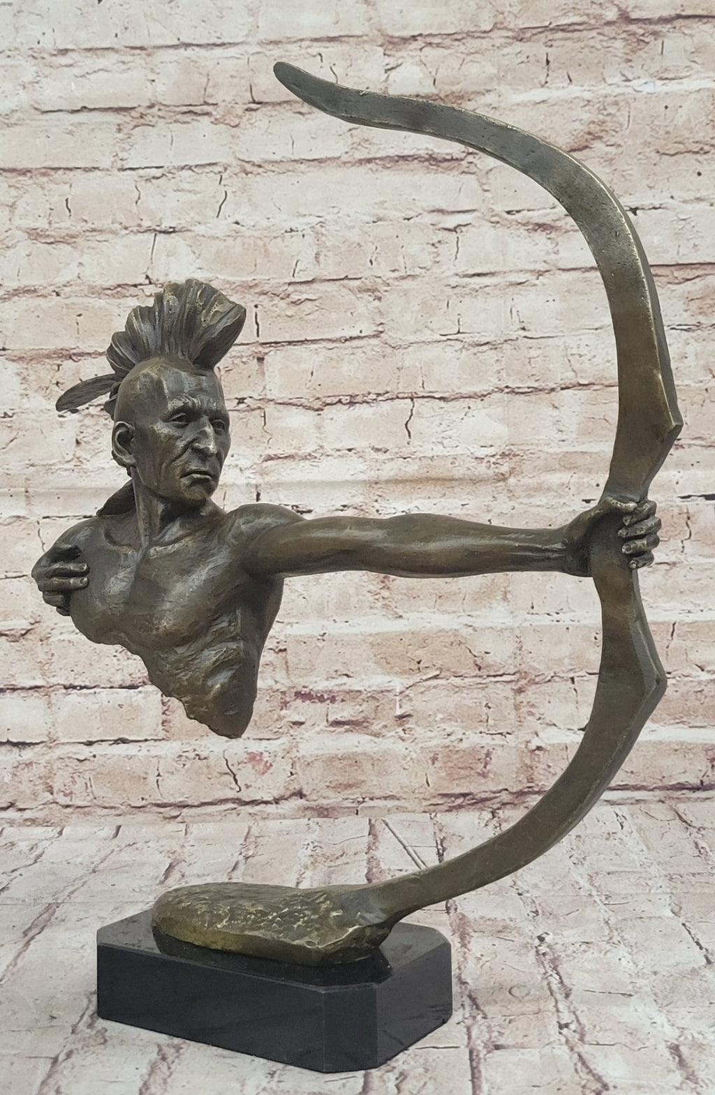 From the right side, the Native American warrior's profile stands in sharp relief, his focus unyielding as he tracks the trajectory of an arrow he has just released. His stance exudes a combination of concentration and mastery, while his outstretched arm anchors the sculpture's dynamism. The artist's meticulous craftsmanship is evident in the lifelike representation of every sinew and detail, allowing us to feel the tension of the warrior's bowstring and the weight of his purpose.