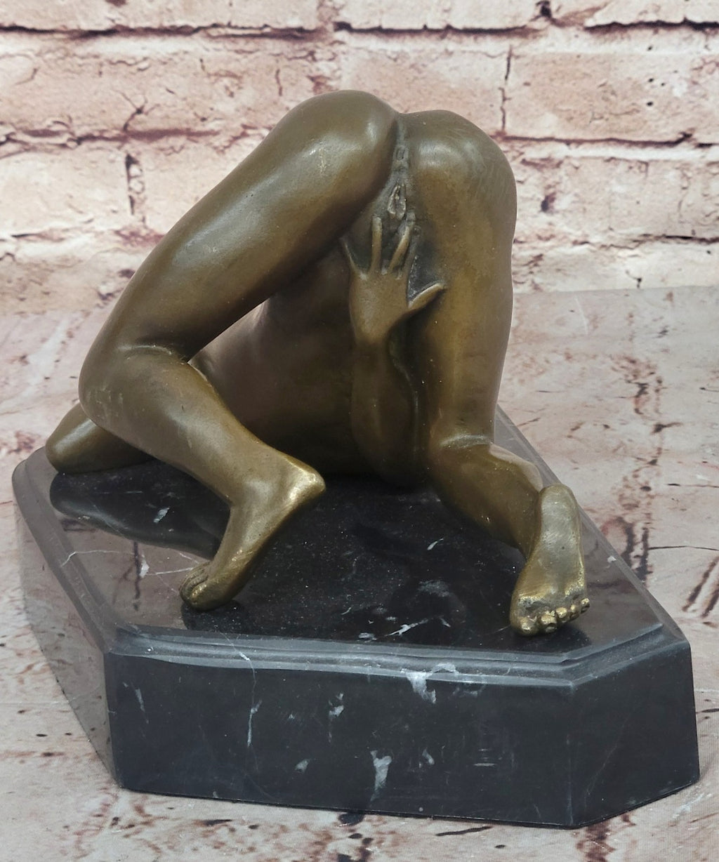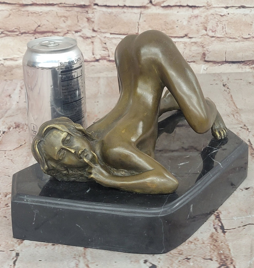 The sculpture features a nude female figure in a seductive pose, with every curve and contour of her body perfectly depicted. The woman's body is gracefully arched, with her head turned to the side, lending a sense of mystery and allure to the piece. Her skin tone has a rich brown patina finish, giving the sculpture a timeless and elegant look.