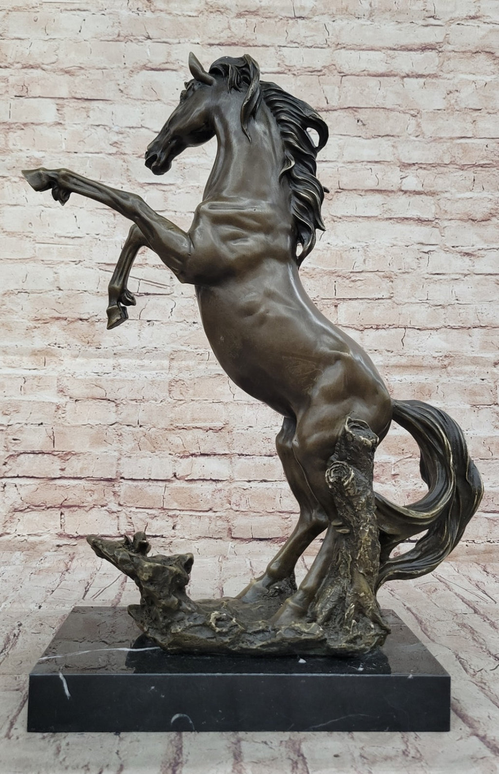The rearing horse is an iconic and easily recognizable pose for these magnificent creatures, revealing their natural emotional responses. This sculpture, expertly crafted using the ancient "Lost Wax Method," beautifully portrays the intricate details of the horse's anatomy and the dynamic posture it assumes during this display of power and emotion.