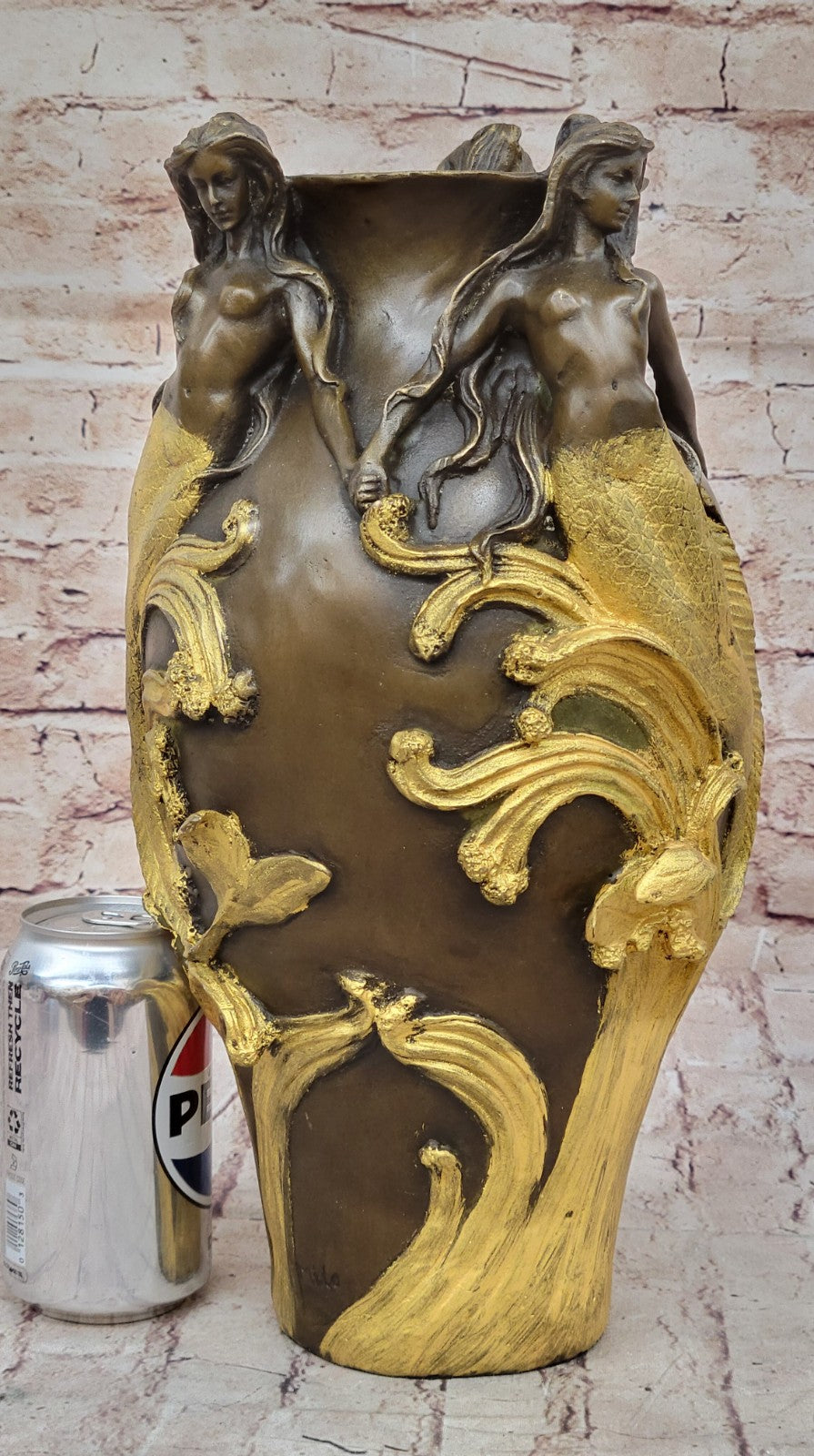 Discover the mesmerizing beauty of this art nouveau bronze vase, featuring a mesmerizing trio of Mermaids gracefully entwined amidst a lush display of flowers and vines. Its versatility knows no bounds, as it effortlessly transforms into a stunning floral centerpiece or a striking standalone decor piece. With its art nouveau flair, this vase emanates an aura of sophistication, making it an ideal focal point in any setting. Skillfully fashioned using the esteemed "Lost Wax Method" and handcrafted to perfection, its impeccable craftsmanship is a testament to the artist's dedication and talent. The alluring combination of brown and gold patina adds a touch of elegance, while the artist's signature, Milo, lends it an air of authenticity and prestige.