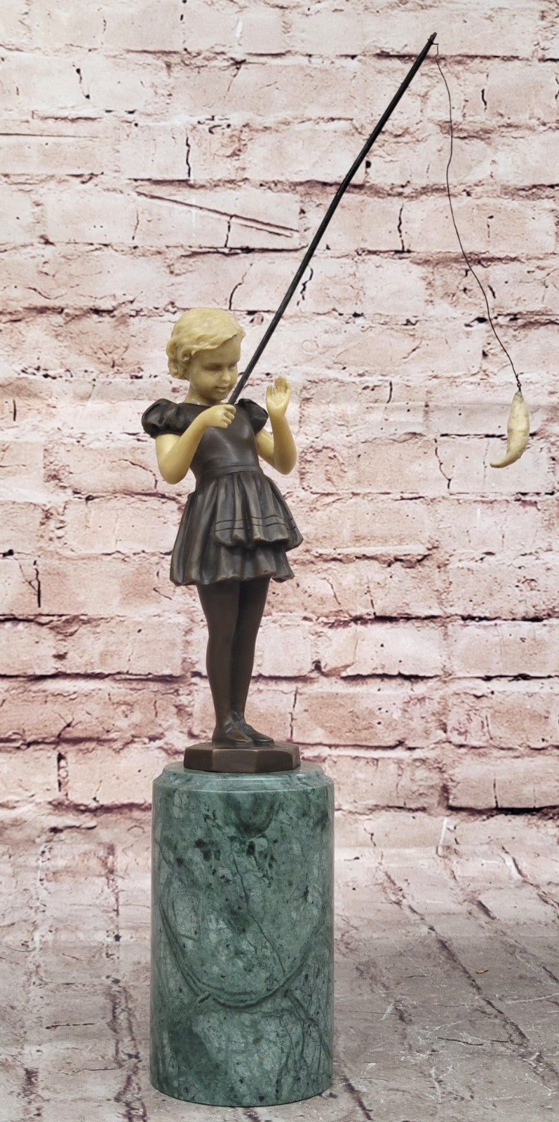 The girl's head and arms are expertly crafted from resin, ensuring a lifelike and detailed representation. This sculpture was created using the renowned "Lost Wax Method," showcasing the artist's dedication to capturing the essence of the subject. The brown patina finish adds depth and richness to the sculpture, complementing its overall aesthetic.