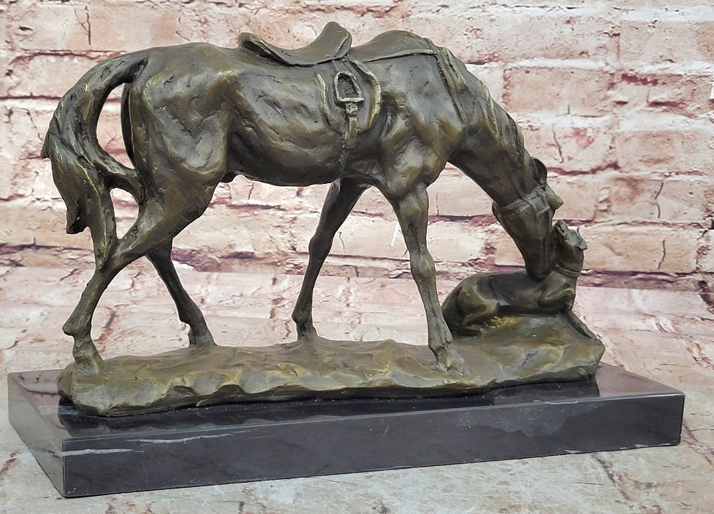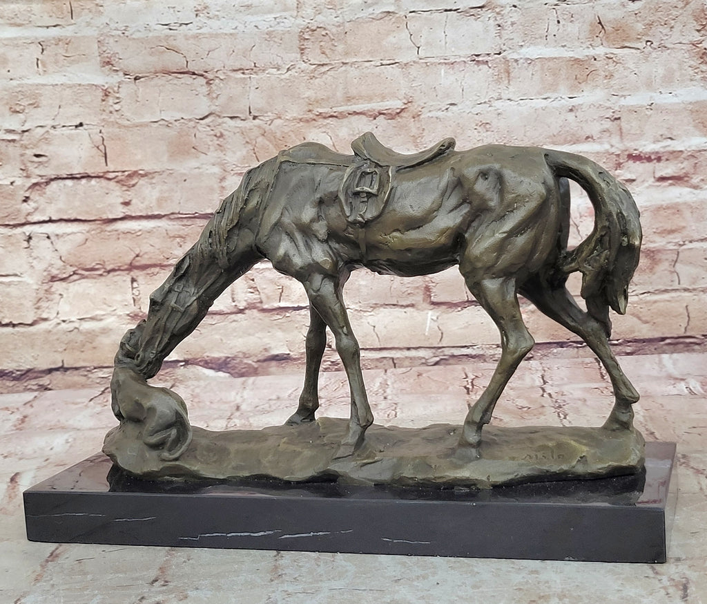 The artist's exceptional craftsmanship shines through in the intricate details of the sculpture. Each meticulously sculpted muscle of the horse and the flowing mane showcases the artist's dedication to capturing the essence of these remarkable creatures. Crafted using the ancient lost-wax casting techniques, the sculpture exudes a timeless quality that will be cherished for generations to come. The rich brown patina finish adds depth and character to the piece, highlighting the intricate details and enhancing its overall beauty.