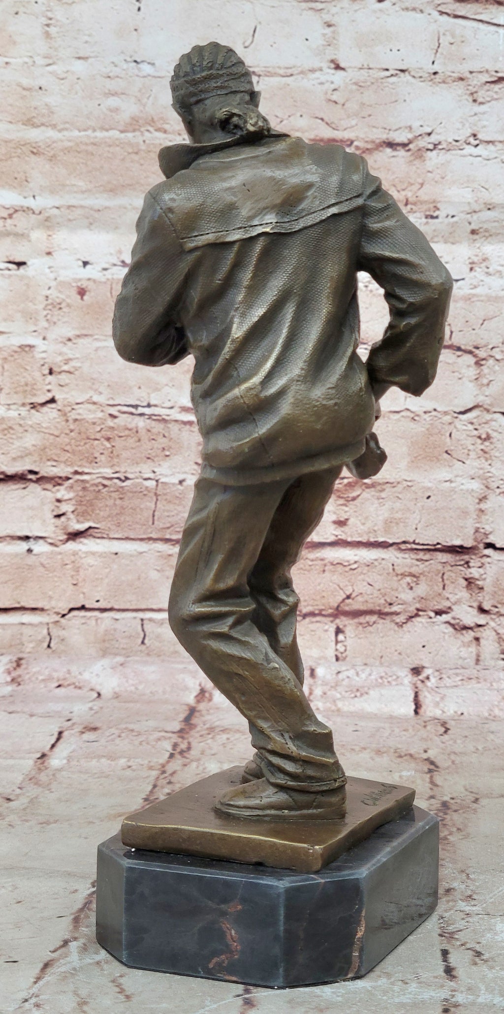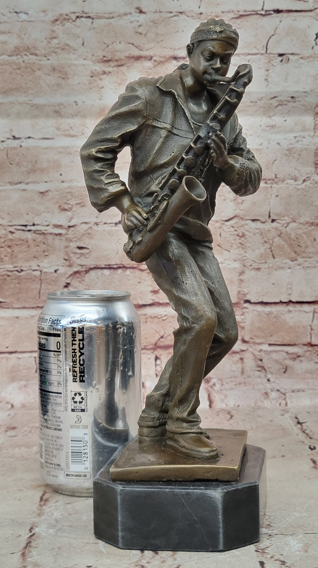 Crafted with exceptional detail, this sculpture captures the dynamic movement and essence of a saxophonist lost in his music. The lost-wax casting method ensures a high-quality bronze sculpture, while the two-toned brown patina adds depth and character to the piece. The intricate details, from the folds in the suit jacket to the posture of the musician, showcase the artist's skill and creativity.