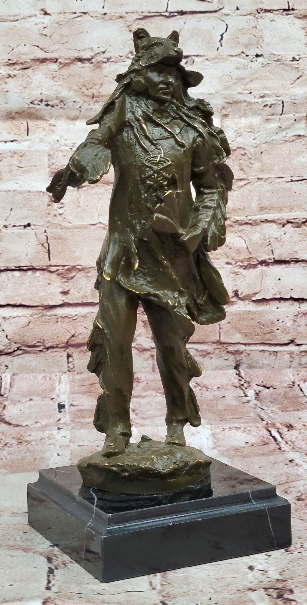 Handcrafted using the lost wax method, this solid bronze figure showcases exceptional texture and definition, from the flowing feathers of the headdress to the folds in the figure's garment. The rich brown patina enhances the depth and adds a warm, aged quality, complementing the piece’s historical essence.