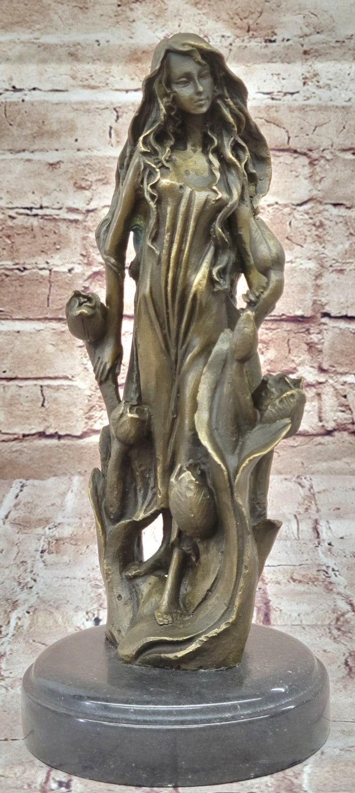 This beautiful bronze sculpture portrays a woman seated amidst a gorgeous flower garden, having picked a bouquet of diverse blooms for her home. She is dressed in an elegant, long, yet sexy dress that reveals her legs, adding to the charm of the scene. The beauty sits looking down to her right side, perhaps contemplating if there's anything else she might want to pick. Her hair, adorned with a bow, cascades gently down her back, enhancing her graceful appearance.