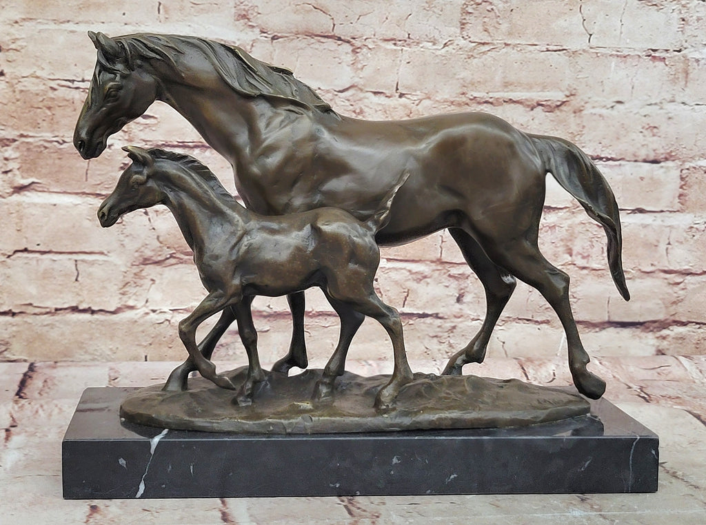 Experience the artistry and craftsmanship of this exquisite bronze sculpture that captures the intimate bond shared between the mare and her foal. Handmade with meticulous attention to detail, the sculpture boasts a nuanced two-toned brown patina, enhancing the lifelike qualities of the figures and lending a sense of depth and warmth to the overall composition. Crafted using the revered "Lost Wax Method," this sculpture embodies the enduring legacy of this traditional casting technique, ensuring a timeless and enduring piece of art that reflects the tender and nurturing relationship between mother and offspring.