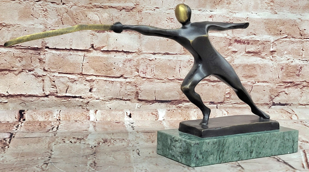 This dynamic bronze sculpture captures the intensity and precision of a fencer in the heat of competition. The fencer, poised for victory, stands with his épée extended in a strong attacking stance, reflecting his unwavering focus and determination to overcome his opponent. Every detail of his form, from the tension in his stance to the sharpness of his gaze, conveys the disciplined artistry and skill required in the sport of fencing.