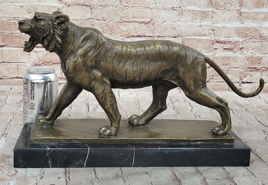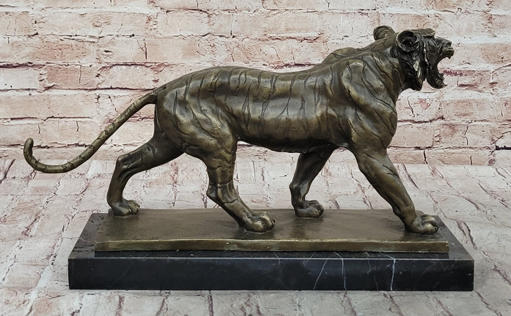 Crafted using the esteemed "Lost Wax Method," this bronze sculpture showcases the artist's dedication to capturing the essence of the tiger with unparalleled craftsmanship. Finished with a two-toned brown patina, the sculpture radiates warmth and sophistication, making it a perfect gift for any animal lover. Signed by the artist Barye, this sculpture is not only a stunning work of art but also a timeless tribute to the enduring majesty of the tiger.