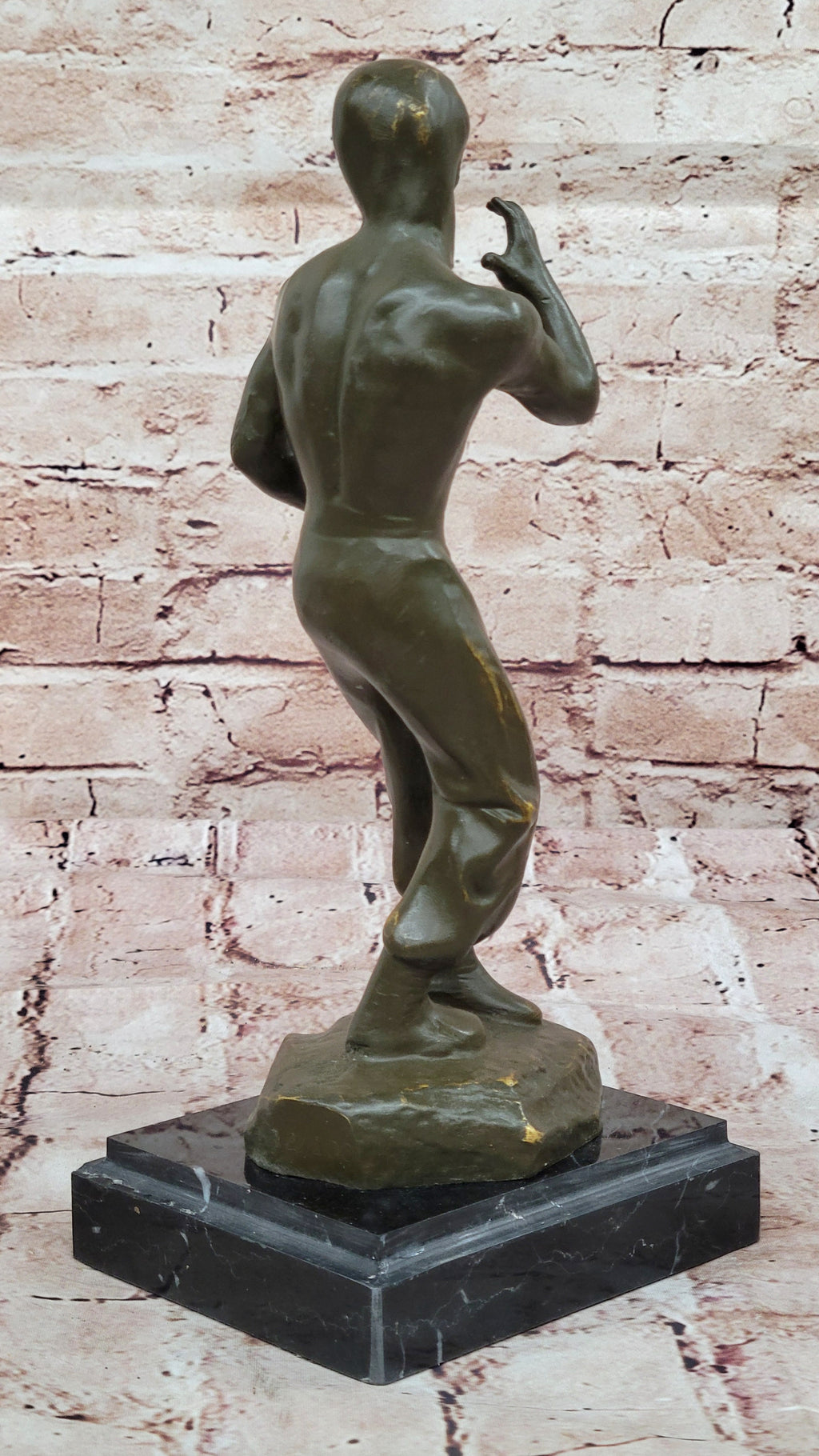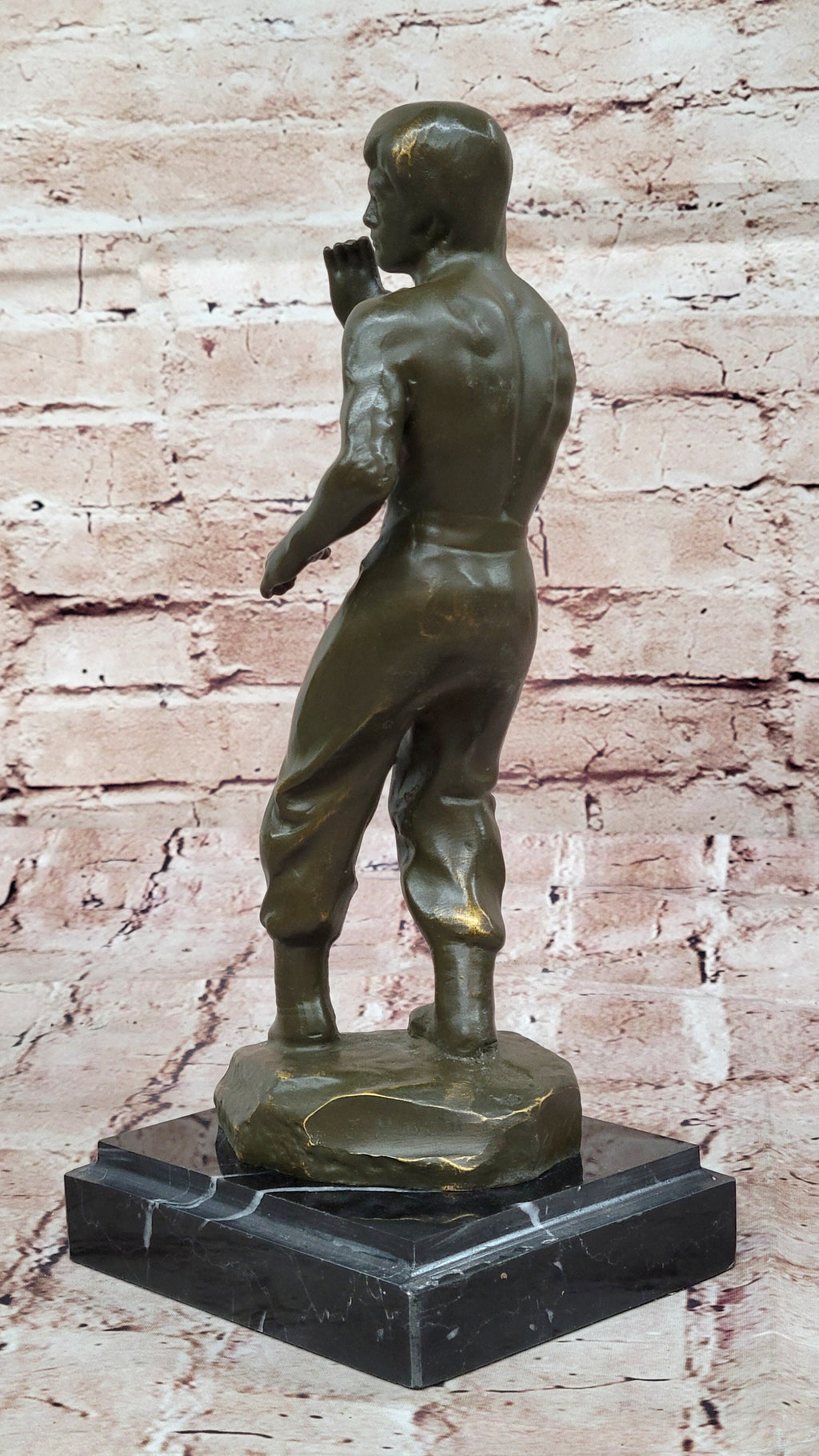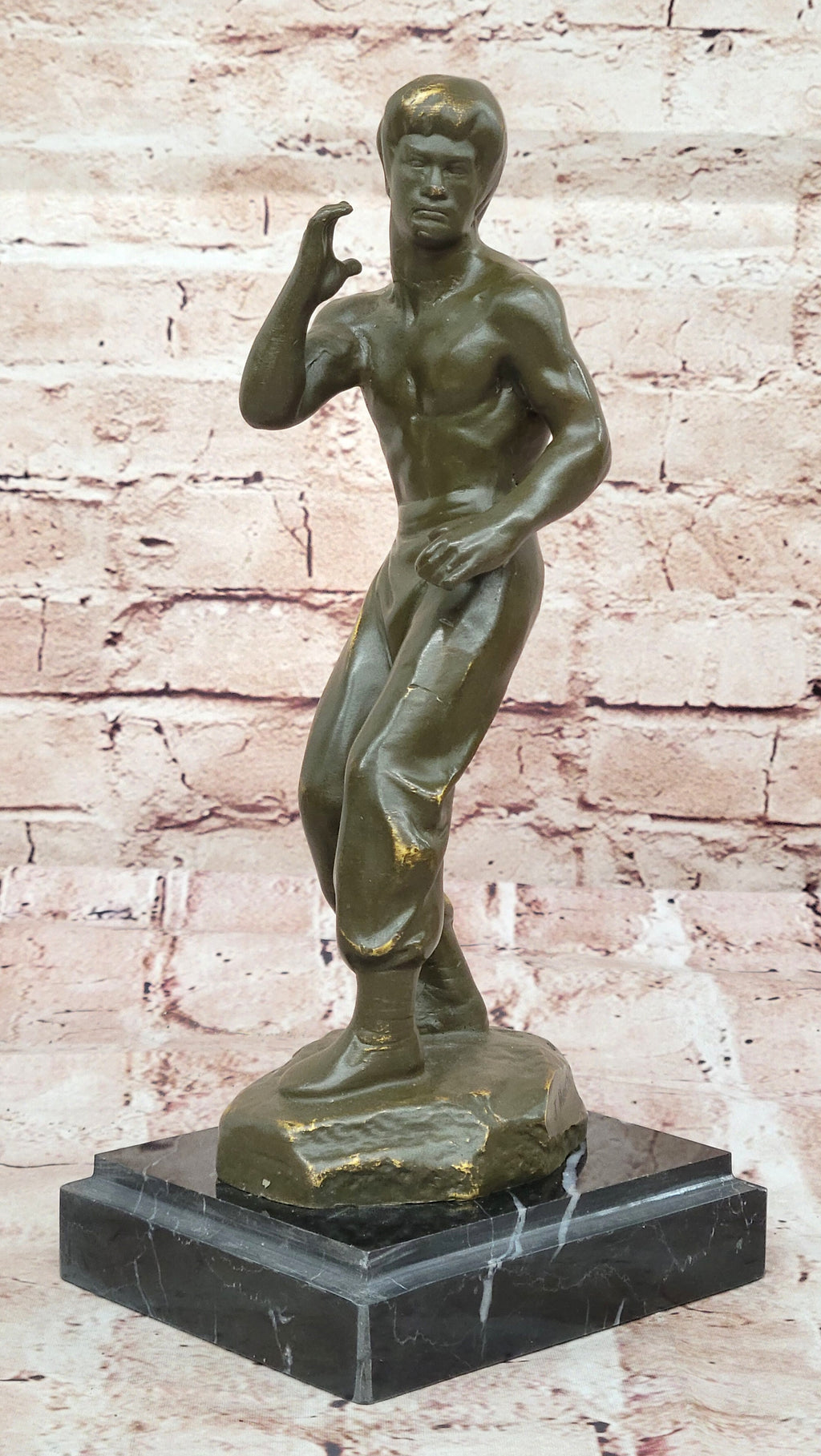 The sculpture captures Bruce Lee in a dynamic pose, highlighting his strength, discipline, and iconic martial arts prowess. Finished with a rich brown patina, the artwork is mounted on a black square marble base, adding a touch of sophistication and stability.