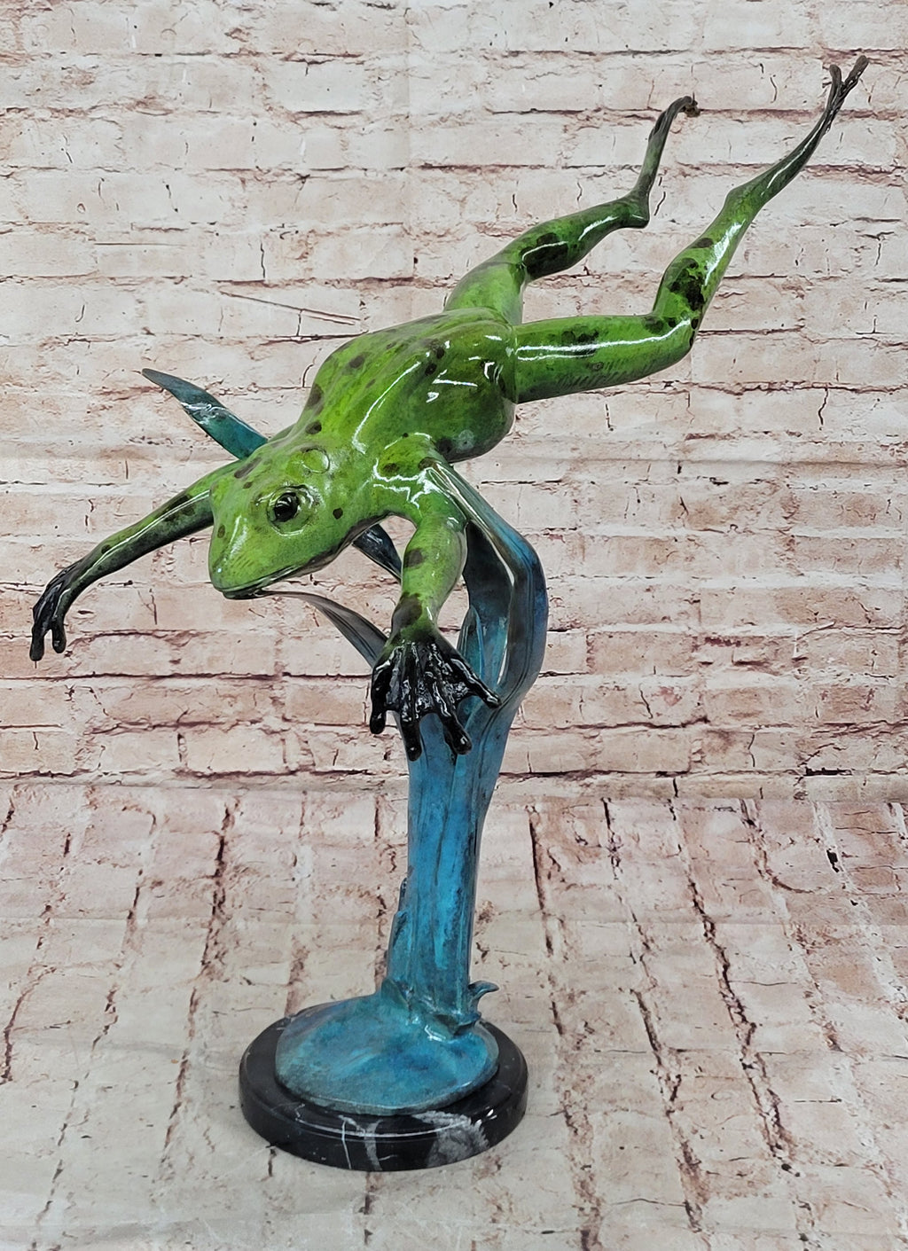 The lifelike facial characteristics, including eye sockets, lip lines, and even the intricate details of the frog's ear, add to the authenticity of this one-of-a-kind sculpture. The illusion of the frog floating mid-air creates a sense of motion and captures the elegance of wildlife in a moment of stillness. Mounted on a sturdy black marble base, the sculpture features a hand-painted, special multi-colored patina with hues of baby blues, gorgeous greens, subtle silvers, yellows, and soft blacks.